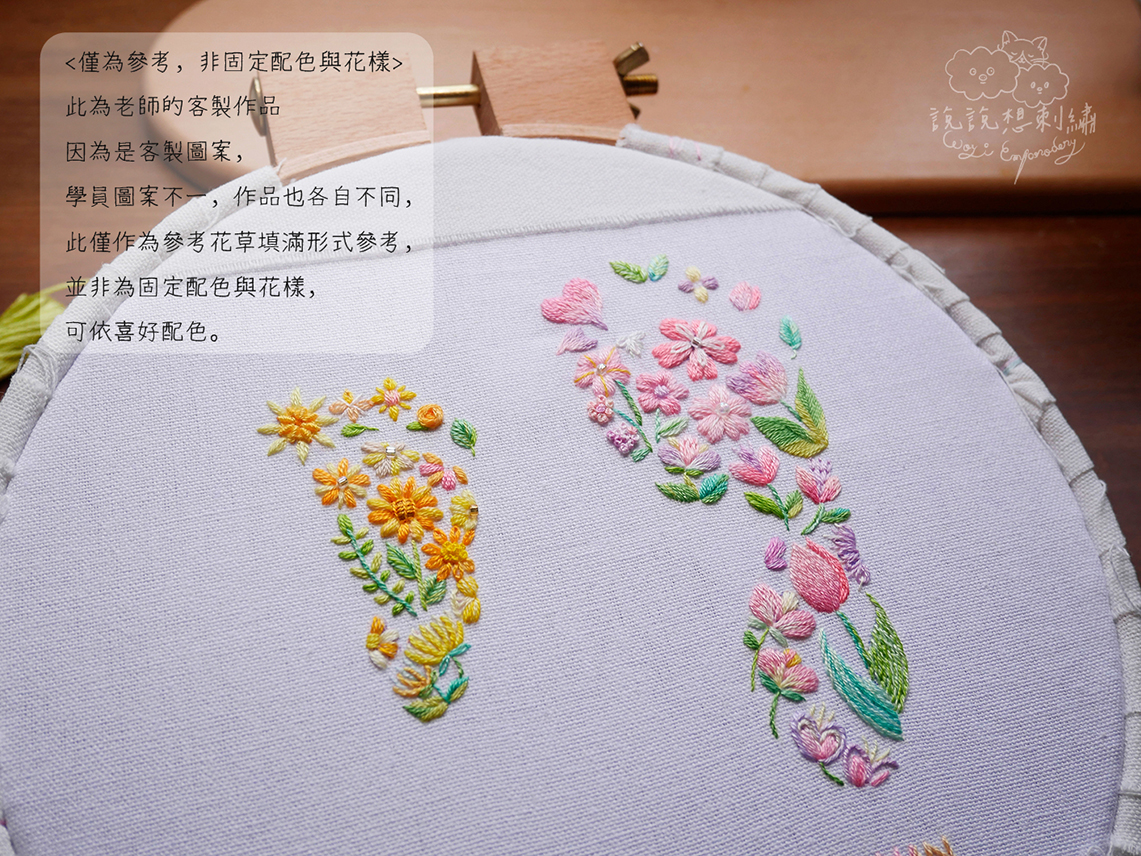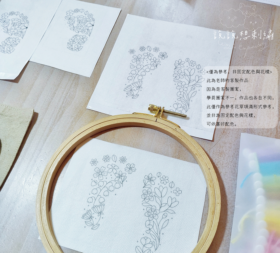 ☑ 針對寶寶腳印輪廓設計專屬花草圖稿繡布。