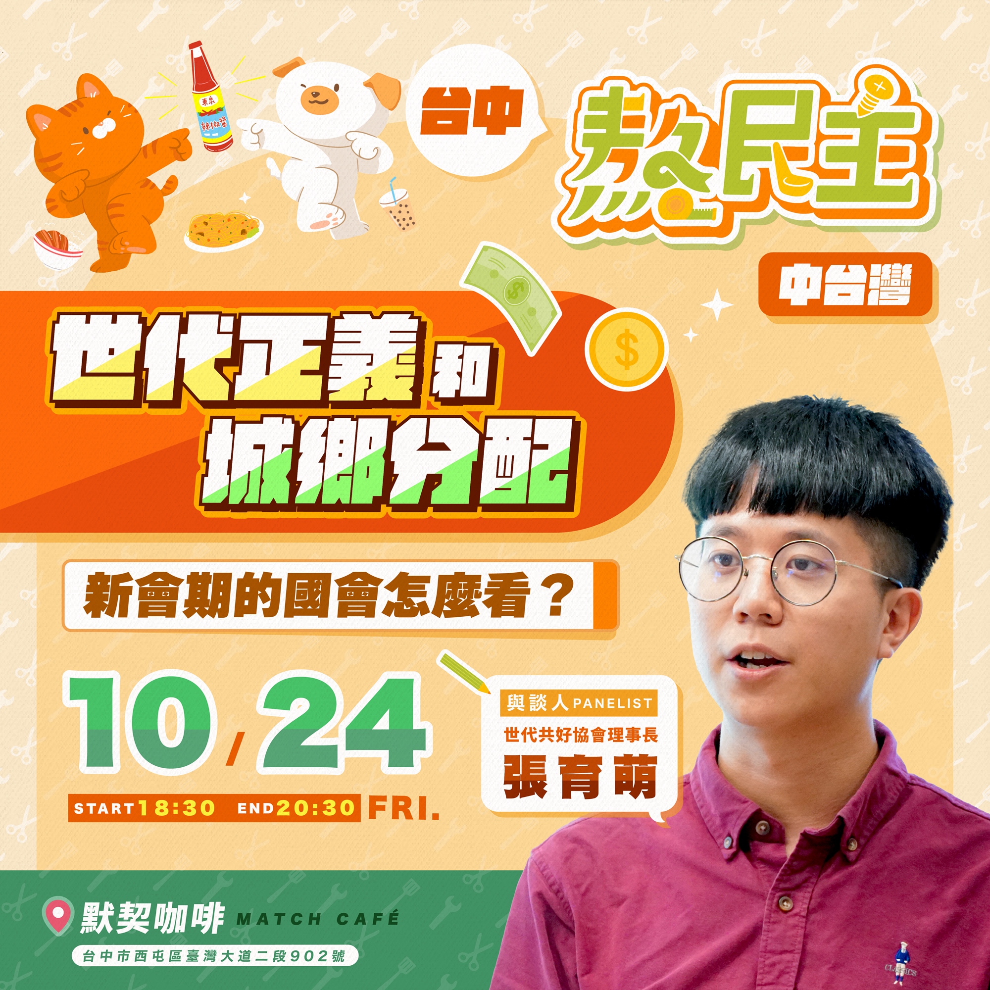 10/24(五)晚上,我們邀請世代共好協會理事長張育萌分享他在NGO的倡議經驗,談談年輕人該如何從體制外監督國會,讓這些代議士可以提出符合世代正義、弭平城鄉差距的立法!