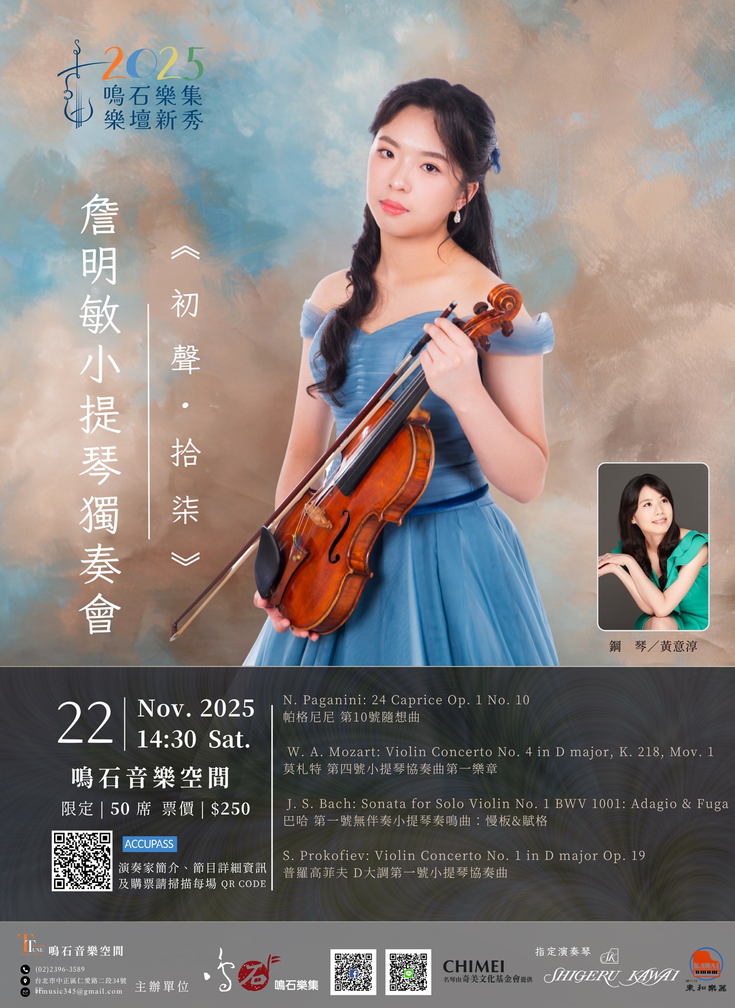 現年17歲的詹明敏從小讀音樂班,將偕同鋼琴家黃意淳老師挑戰個人首場小提琴獨奏會。