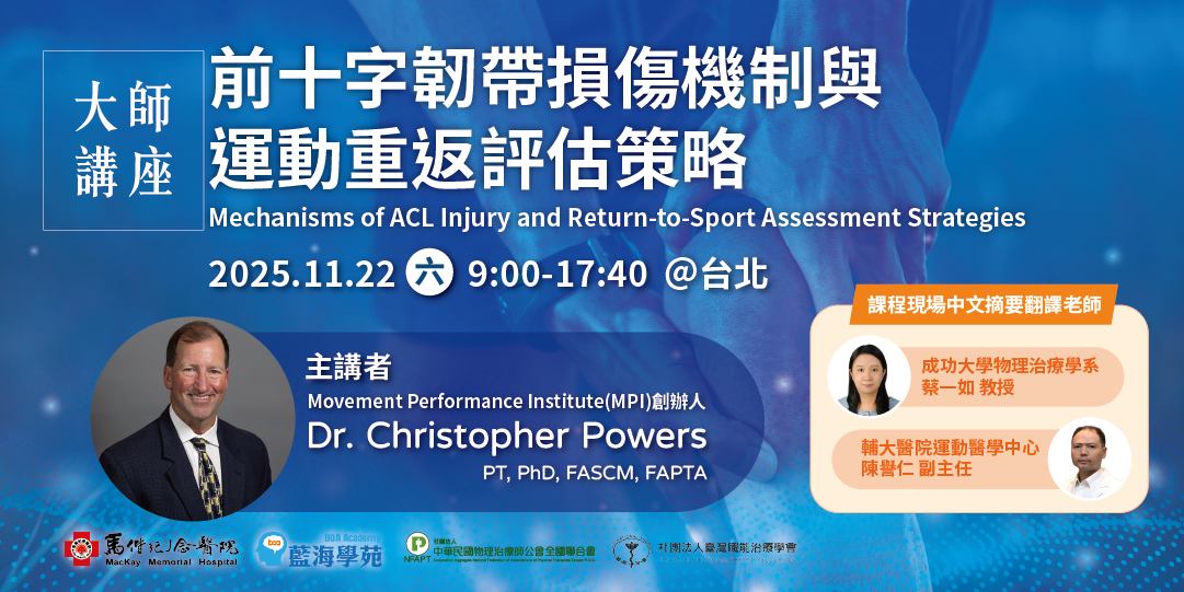 藍海學苑特別邀請美國南加州大學(USC)生物運動學與物理治療系教授暨副主任 Christopher Powers博士擔任主講人,Dr. Powers是國際知名的運動生物力學專家,目前擔任肌肉骨骼生物力學研究實驗室的聯合主任,並於南加州大學指導生物運動學課程。他的研究專注於人類運動的生物力學,特別著重於運動生理學、生物力學和肌肉活動的改變如何導致下肢傷害,對膝關節及髕股關節功能障礙的病理機制有深入的研究。