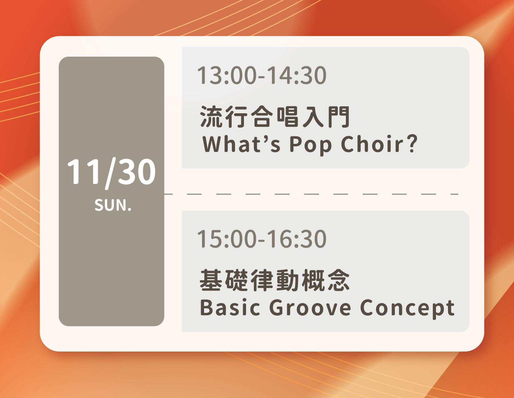 四堂課、四個不同的觀點,深入解析、認識兩首流行合唱曲目。第一堂課從「流行合唱的聲響與音色融合」了解咬字之後,從這堂課了解團隊不同音色可以在什麼時機點使用,並同步追求聲音的「融合性」。在流行合唱團中,每一位歌手都應該是主動的節奏穩定者,因此在第二堂「Groove與身體的連結」,我們將學習如何掌握 Groove 進而帶動音樂呈現。第三堂則邀請在流行合唱與阿卡貝拉領域耕耘多年的劉靜諭老師,帶來中文流行合唱歌曲詮釋。跟其他音樂表演者相比,歌手最強大的武器就是「歌詞」,我們將一起學習如何透過咬字分辨流行與否及詮釋中文流行合唱歌曲。最後,由一日限定的流行合唱團體驗收尾。「一日流行合唱團」(One Day Choir)是近年來在歐美很流行的活動,參與者不需參加甄選,不會看譜的好奇寶寶也可以參加,從中實踐不同的流行合唱歌唱技巧,最重要的是,可以一起體驗流行合唱的樂趣。