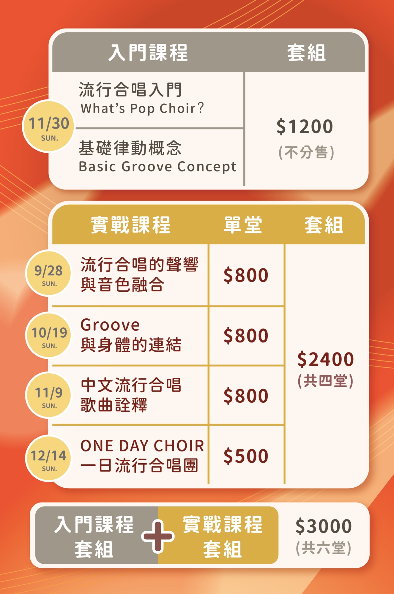 - 每堂課程 90 分鐘、One Day Choir 120 分鐘。課程開始前 15 分鐘開放報到。