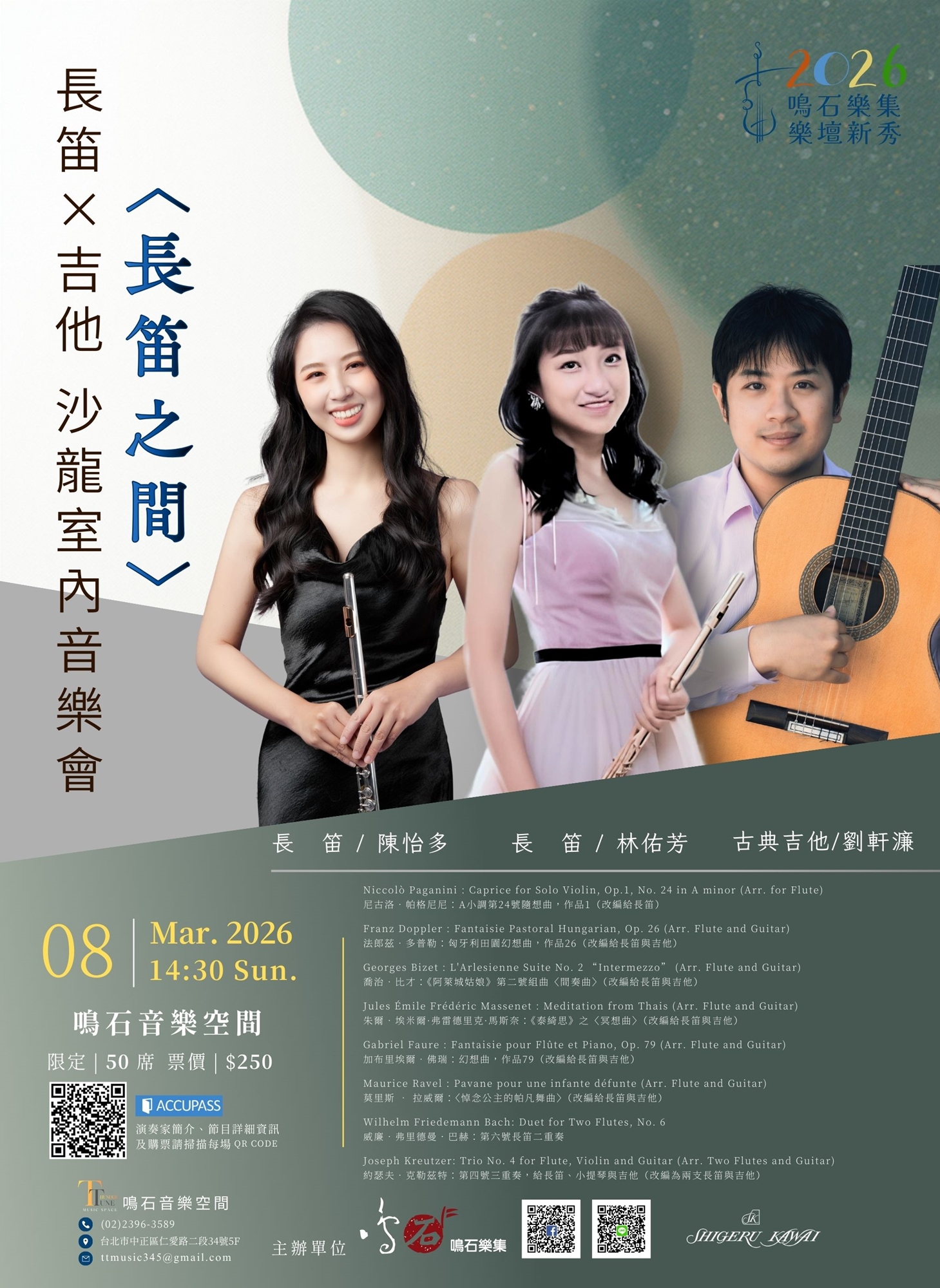 長笛×吉他 沙龍室內音樂會精選多首古典與浪漫時期經典作品的改編版本,透過長笛與吉他的組合,展現不同於鋼琴,更通透、織體輕盈的室內樂魅力。