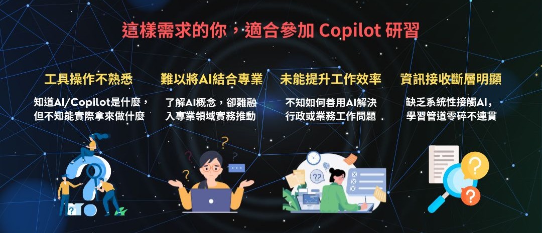 A:為了確保順利參與實作活動,請事先準備好可使用的 Microsoft 365 Copilot 帳號,以利完整體驗課程內容。若無 Microsoft 365 Copilot 帳號請洽官方專員。