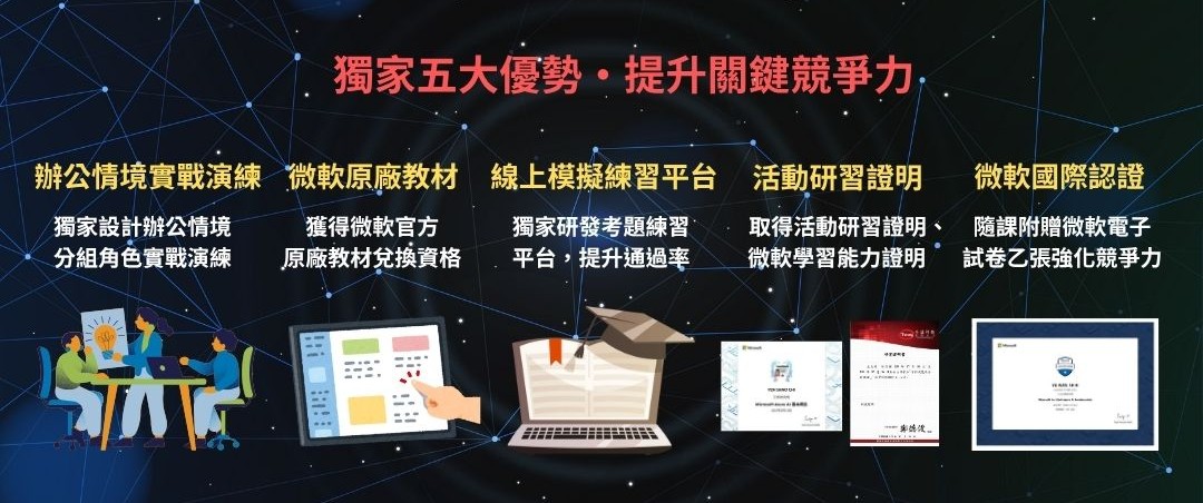 A:課程內容、微軟原廠線上教材、研習證明,額外贈線上題庫模擬練習、微軟認證電子試券。