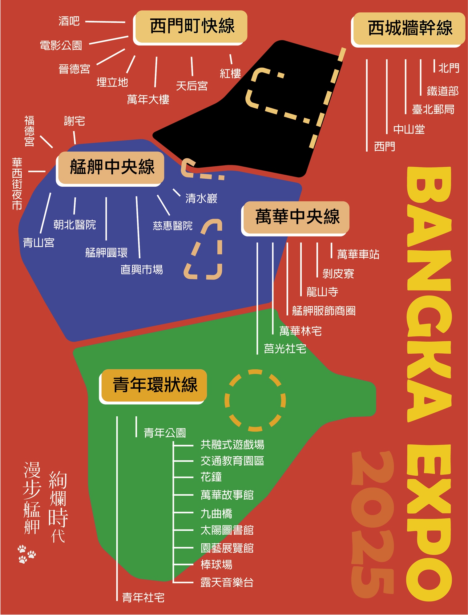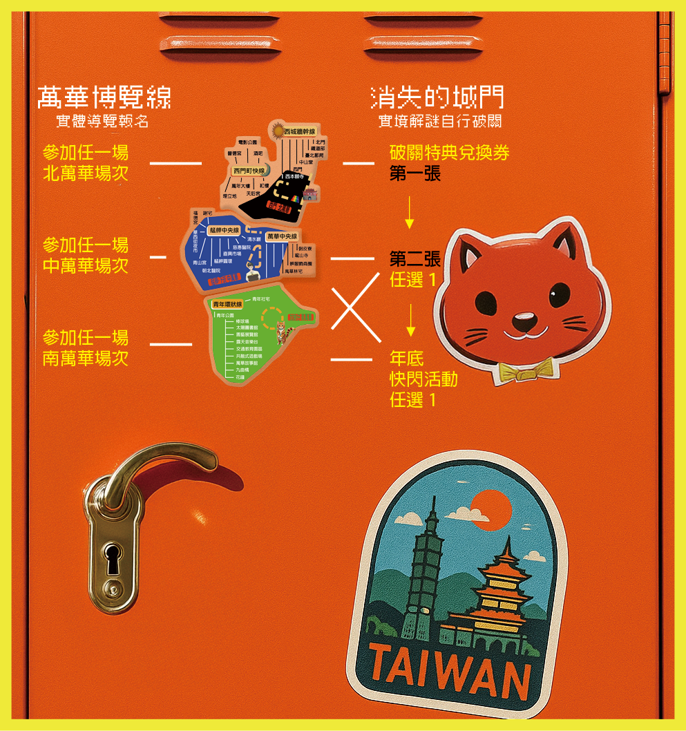 《日查夜訪 消失的城門》是慢步艋舺絢爛時代於2025年最新推出的實境解謎遊戲作品,提供民眾自行遊玩(包含兒少簡易及英語版本)。在本次的萬博活動中,同步開設實體導覽場次,讓不熟悉或是對真人導覽有興趣的民眾,也能參與這樣特別的遊戲導覽。若希望自行遊玩的民眾,可轉往活動官網報名申請。