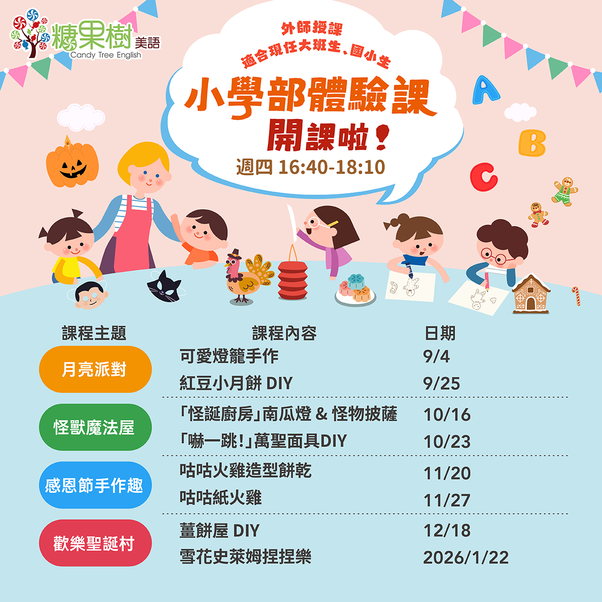 課程時間|週四 16:40~18:10(可協助從學校接回到糖果樹美語)