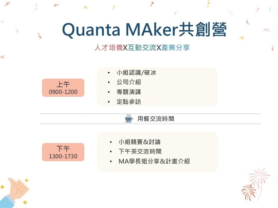 在學時也許還在探索未來的生涯該怎麼選擇,想嘗試各種可能性,但又不知道自己還欠缺什麼能力,或是適合什麼產業,甚至我還有什麼機會可以嘗試?在學時期我又能準備些什麼呢?想了解科技業的生態或是儲備幹部的內容,提早為自己做準備嗎?想先看到廣達工作的環境嗎?廣達MAker共創營將提供同學們一個了解科技業與儲備幹部職缺的機會,與其他學校好手共同跳出現有舒適圈框架,一起共創新的可能性,提前為自己加分!