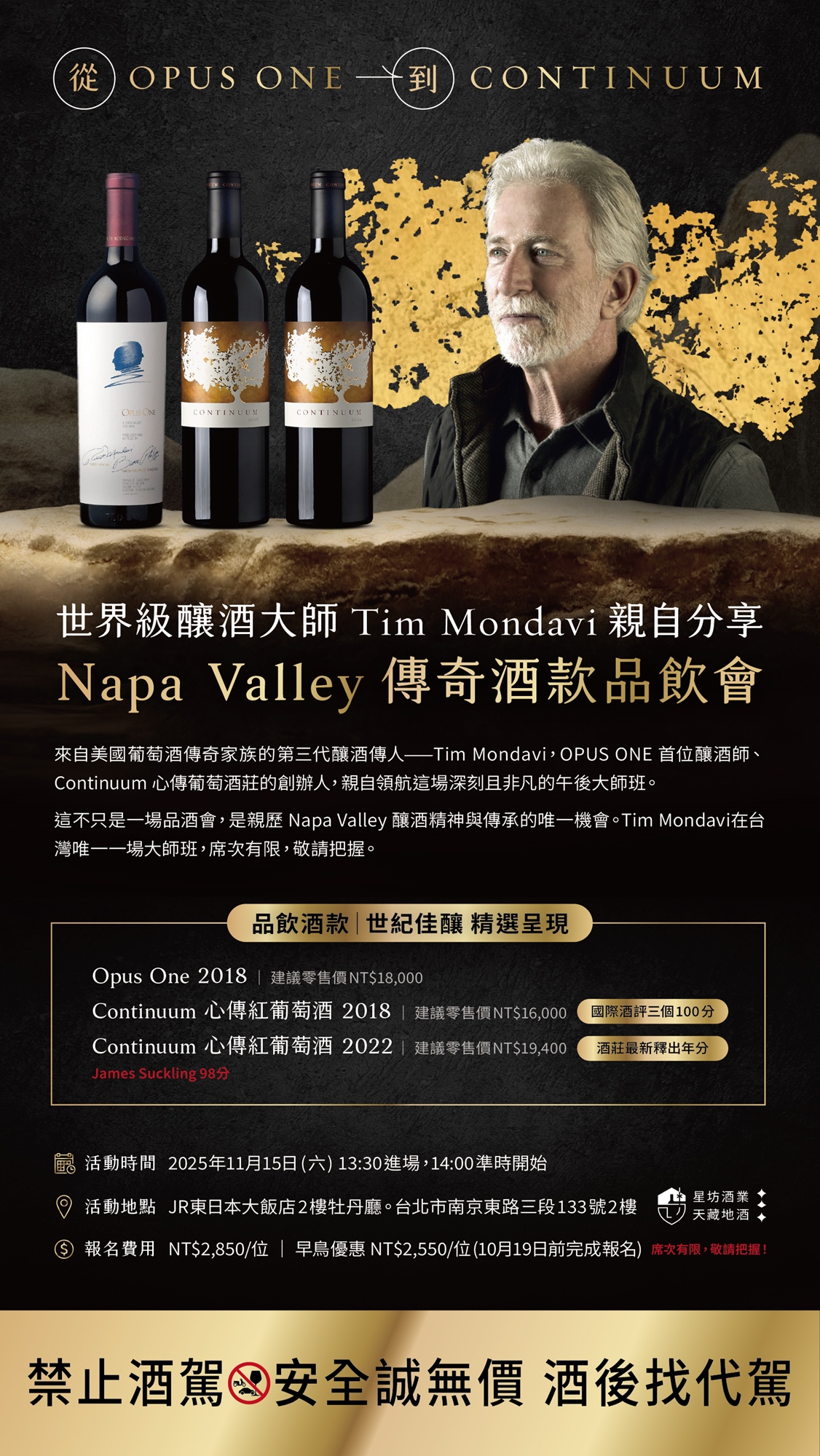 來自美國的 Tim Mondavi,是加州葡萄酒之父 Robert Mondavi 之子、Opus One 的首任釀酒師,同時也是 CONTINUUM 心傳酒莊的創辦人與靈魂人物。這一次,他將在台灣首次親自主持大師班,帶領您穿越 Napa Valley 的傳奇篇章: