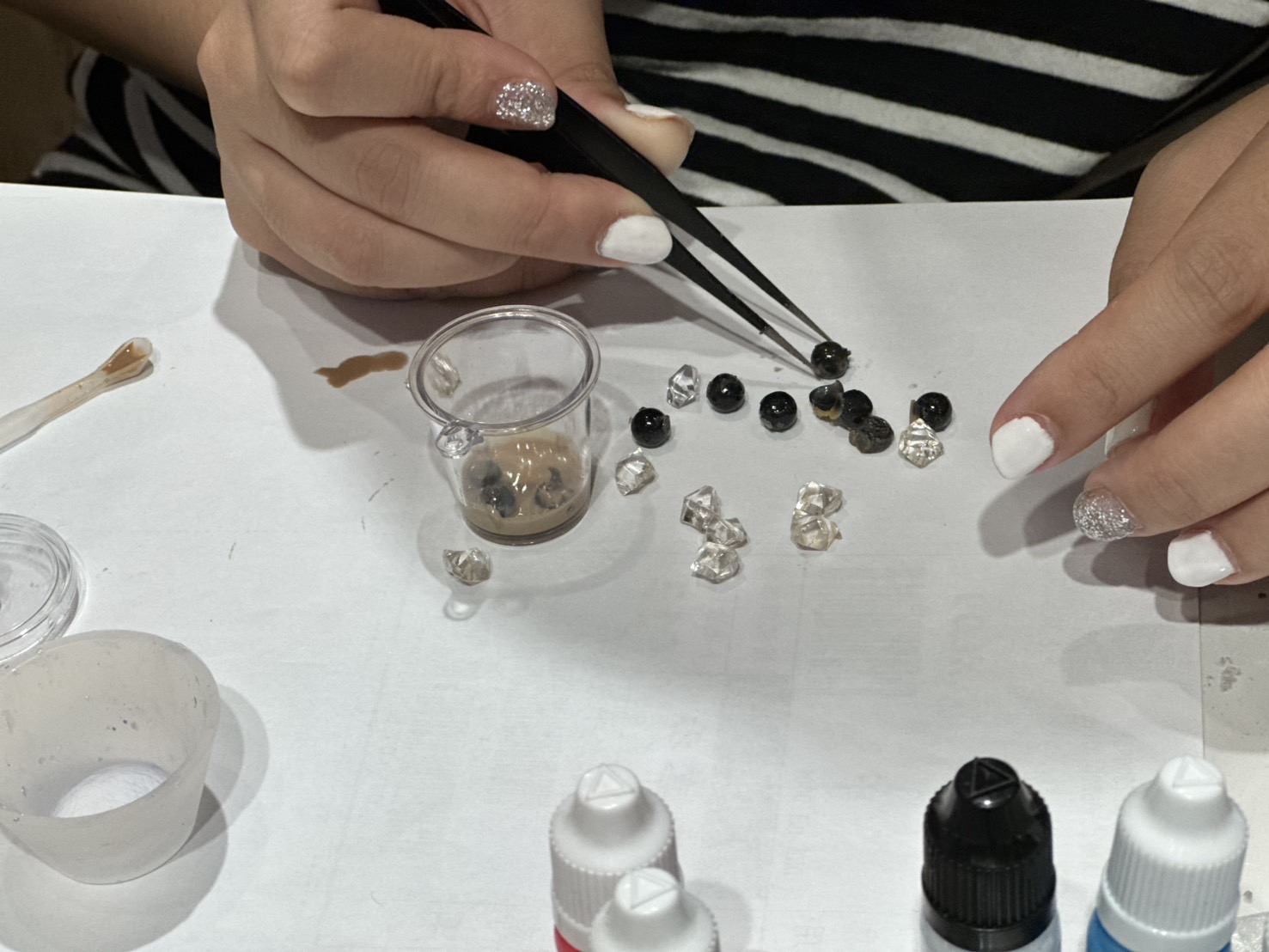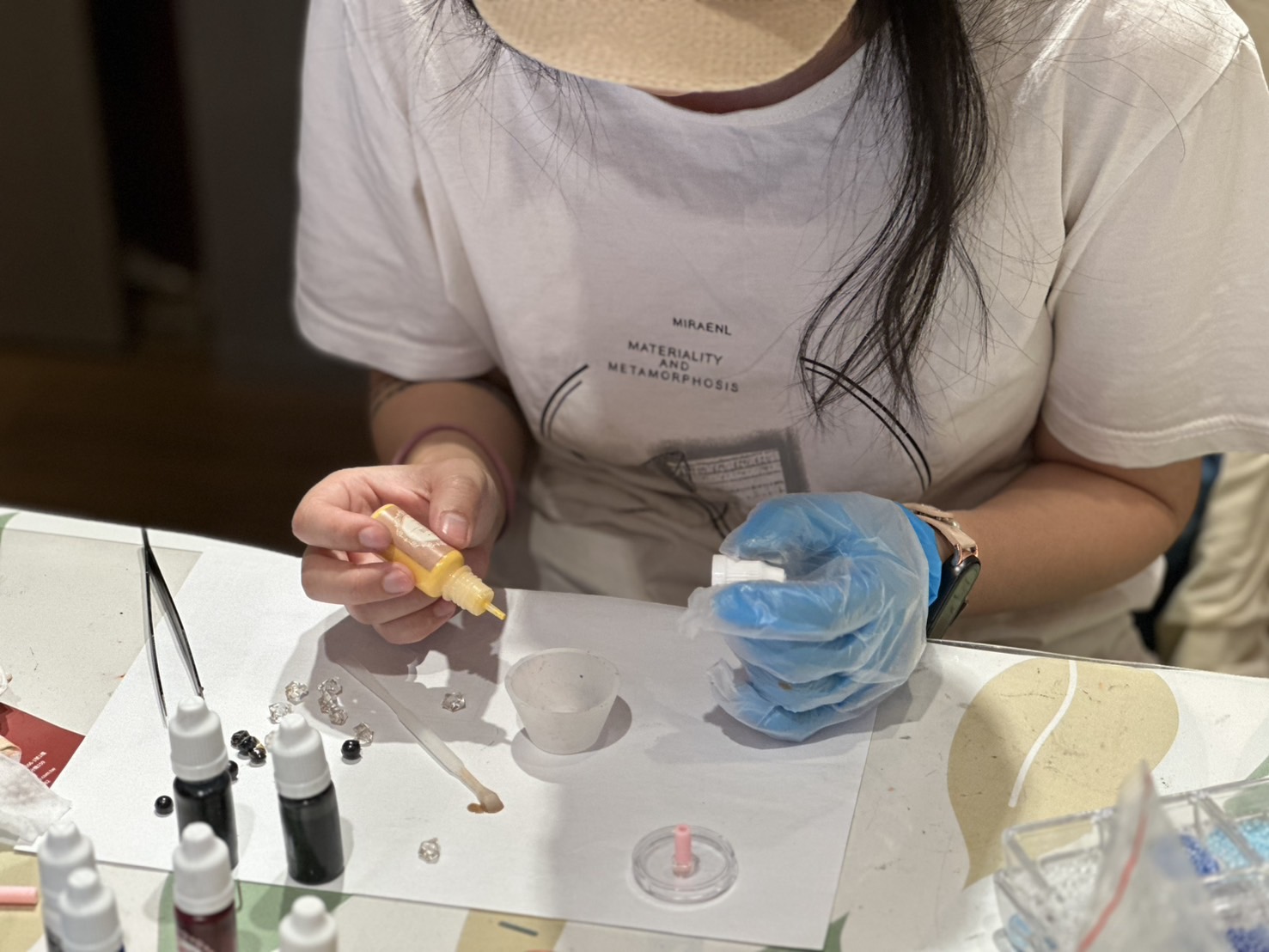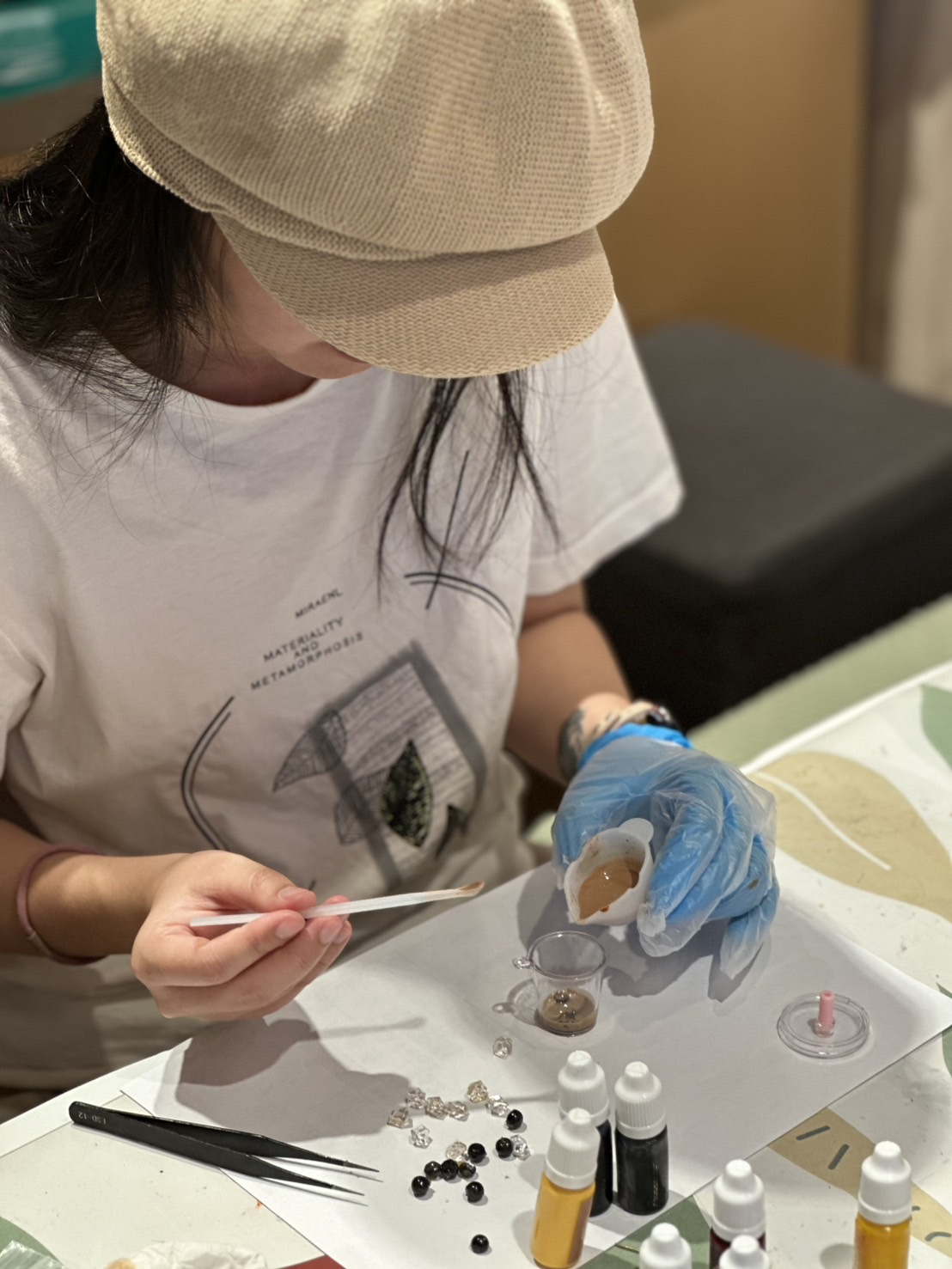 將環氧樹脂與顏料、亮片攪拌均勻,創造專屬色彩。