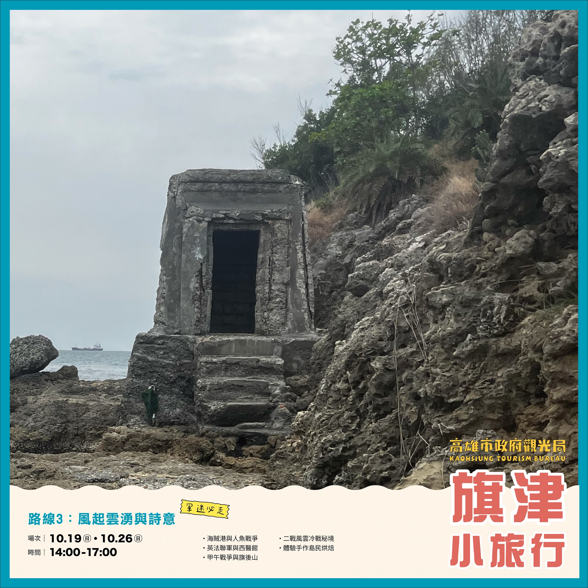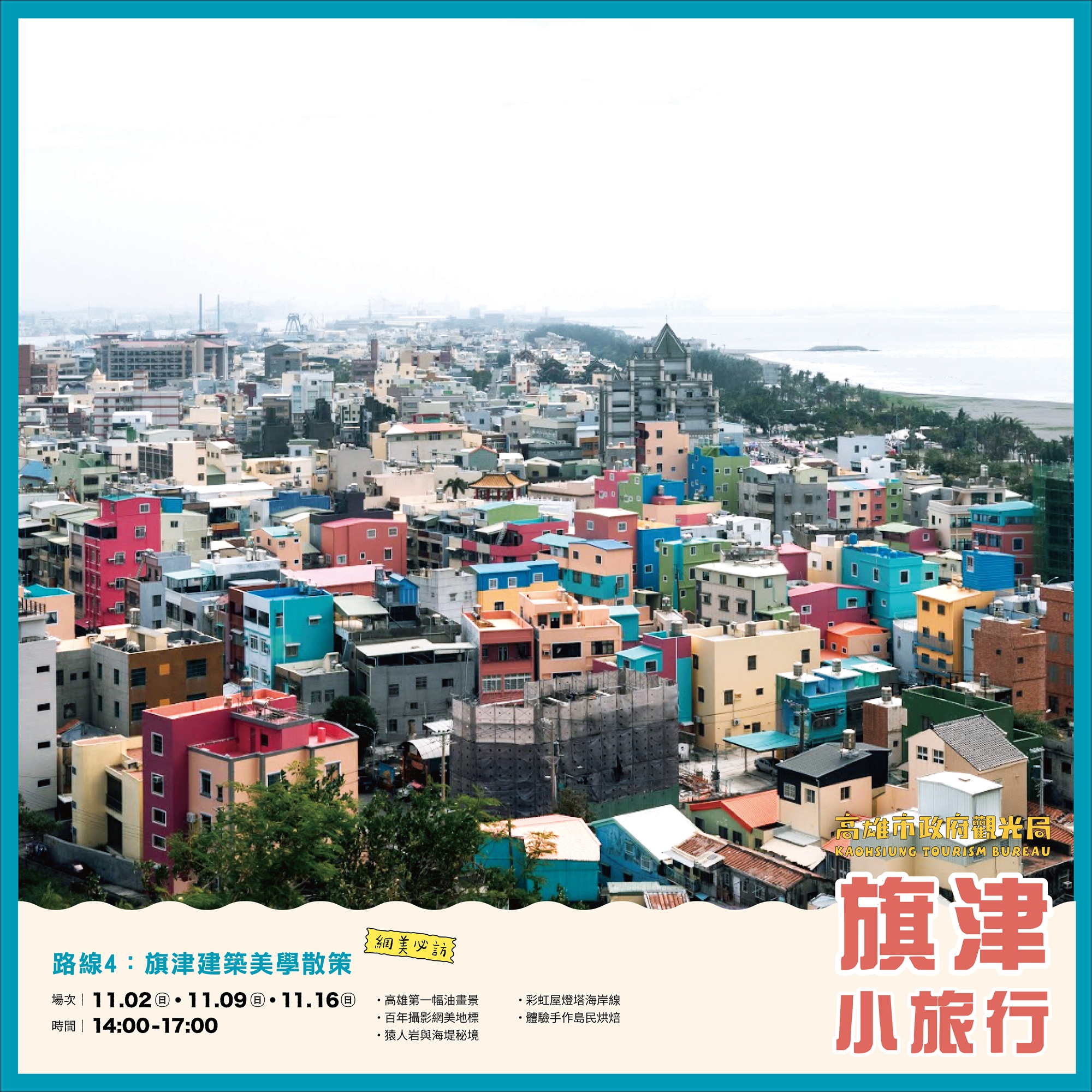 旗津輪渡站集合──旗津吟社(打狗第一詩社)──擺平旗津人魚戰爭的明末天后宮──島民的滋味打狗第一街(通山路)-長老教會與打狗醫館──彩虹屋文正巷──星空隧道──旗後礮台──戰地山徑──高雄燈塔