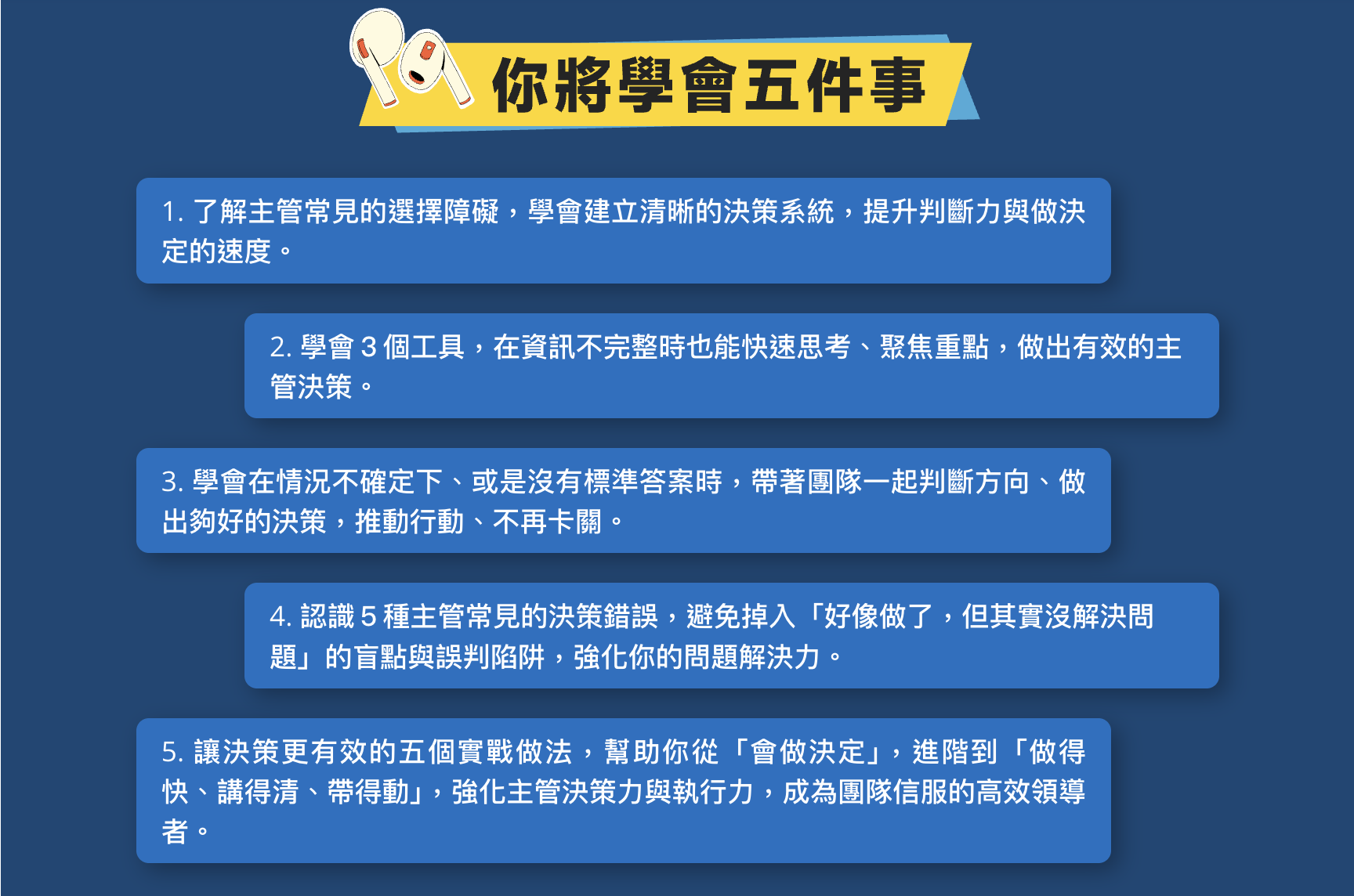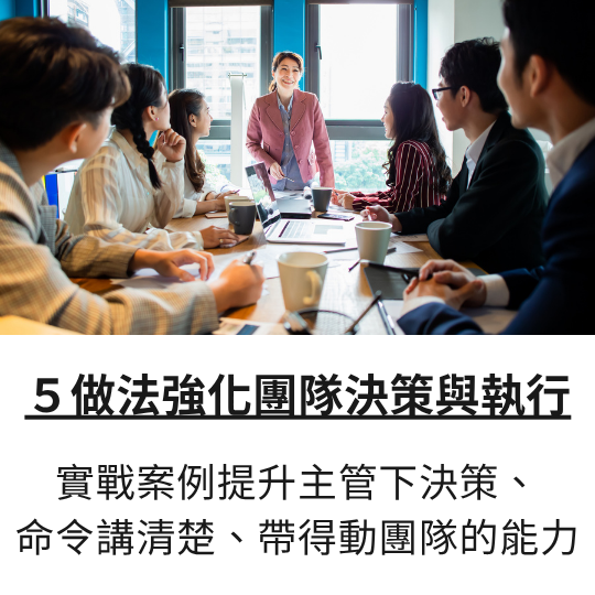 | 講座五:這樣做很加分!主管決策力大升級,五個讓人更服氣的關鍵做法 |