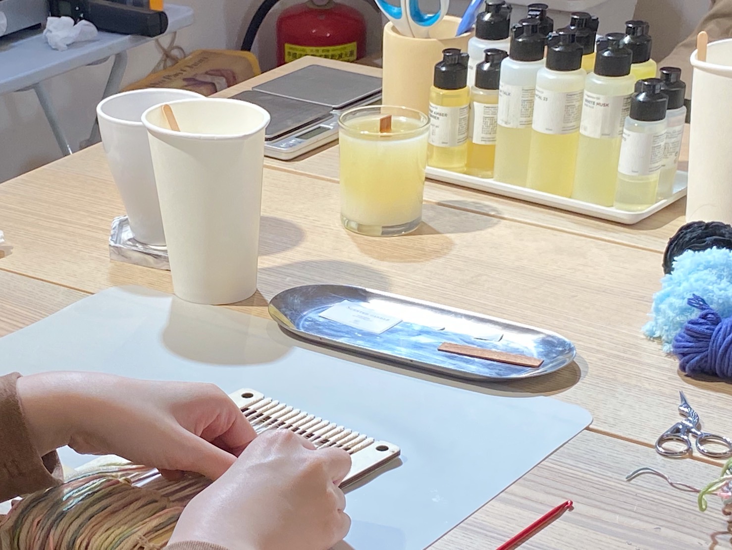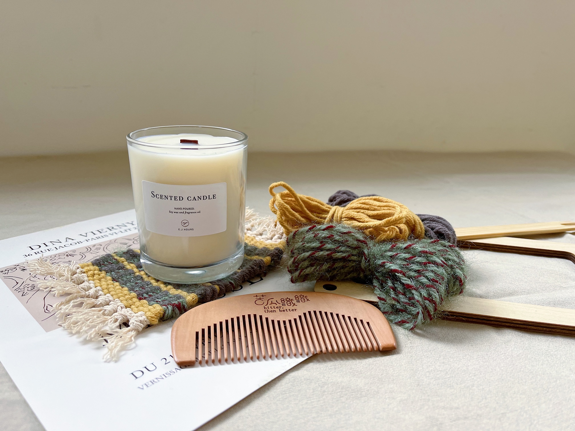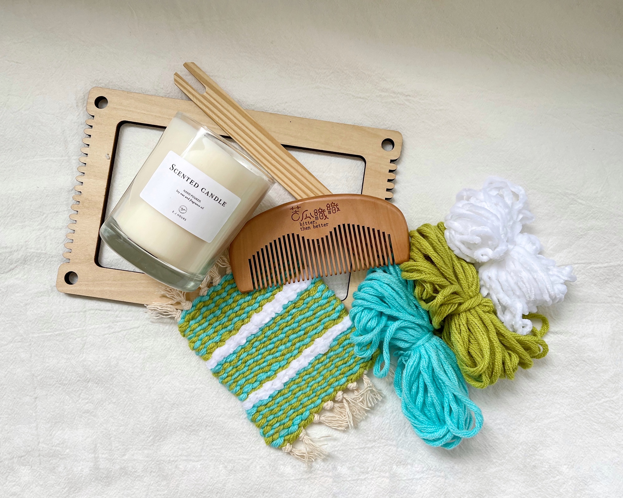◢利用傳統的梭織工藝技巧,將各色絲線、毛絨、緞帶等豐富線材,進行自由創作。此次為了結合香調,特別搭配了三種不同配色的線材,簡易的織紋變化與色彩搭配,將創作出屬於自己的暖心香氛蠟燭墊。