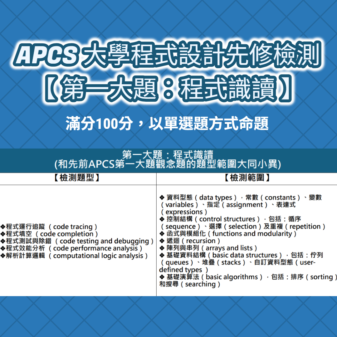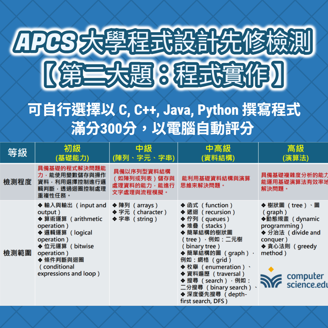 APCS為Advanced Placement Computer Science的英文縮寫,是指「大學程式設計先修檢測」。其檢測模式乃參考美國大學先修課程(Advanced Placement,AP),與各大學合作命題,並確定檢定用題目經過信效度考驗,以確保檢定結果之公信力。