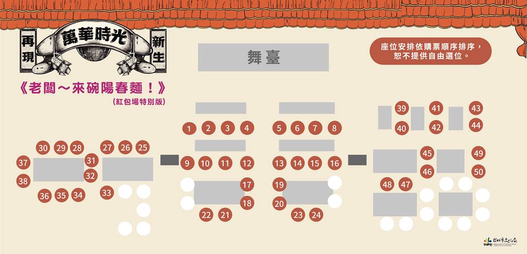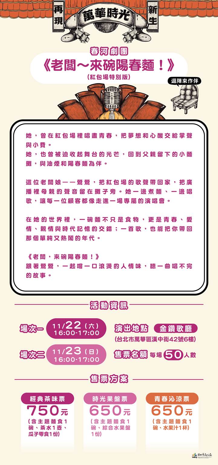 - 萬華限定版本:由「春河劇團」音樂輕喜劇《老闆~來碗陽春麵!》,結合紅包場文化全新演繹!