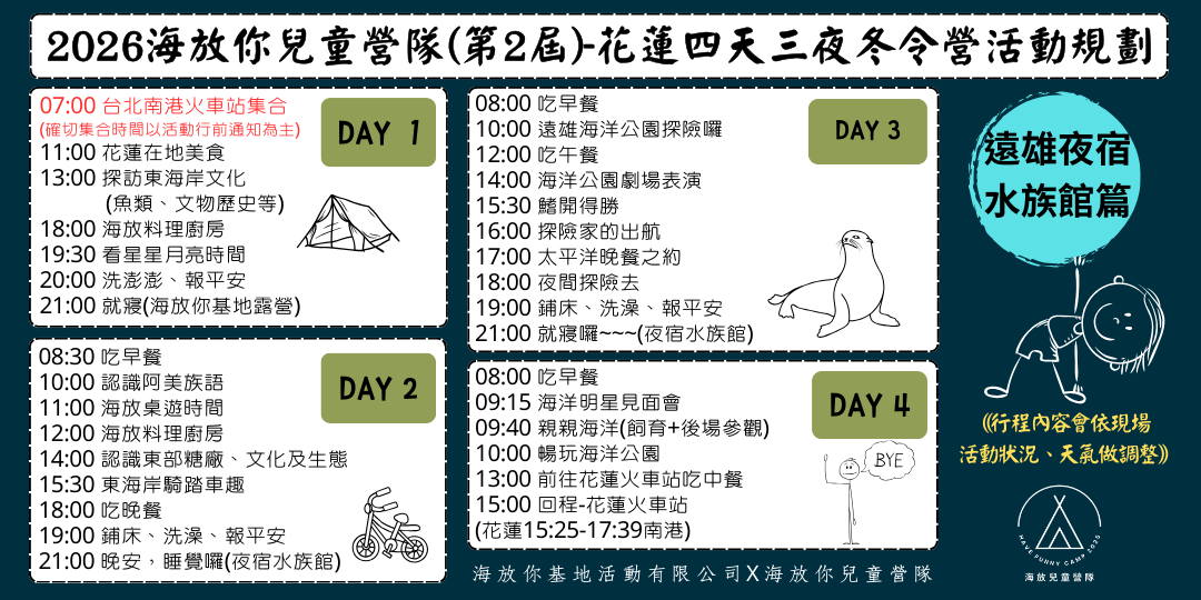 活動過程中會錄影、拍照,部分影像會放置海放你基地活動公司官網作為活動花絮、宣傳及記錄。若不同意孩子照片放上官網,請私訊官方帳號告知主辦方,照片部分將會協助打上馬賽克。若報名之活動場次遇颱風,可順延至後面場次,亦可全額退費;第三場 2026/2/1(日)-2/4(三) 為最終場無其他場次可替換,即全額退費。活動內容可能因現場狀況及天氣進行調整。請加入海放你兒童營隊官方line ( @hellohavefunnybase ),以利主辦方聯絡及後續行前通知。