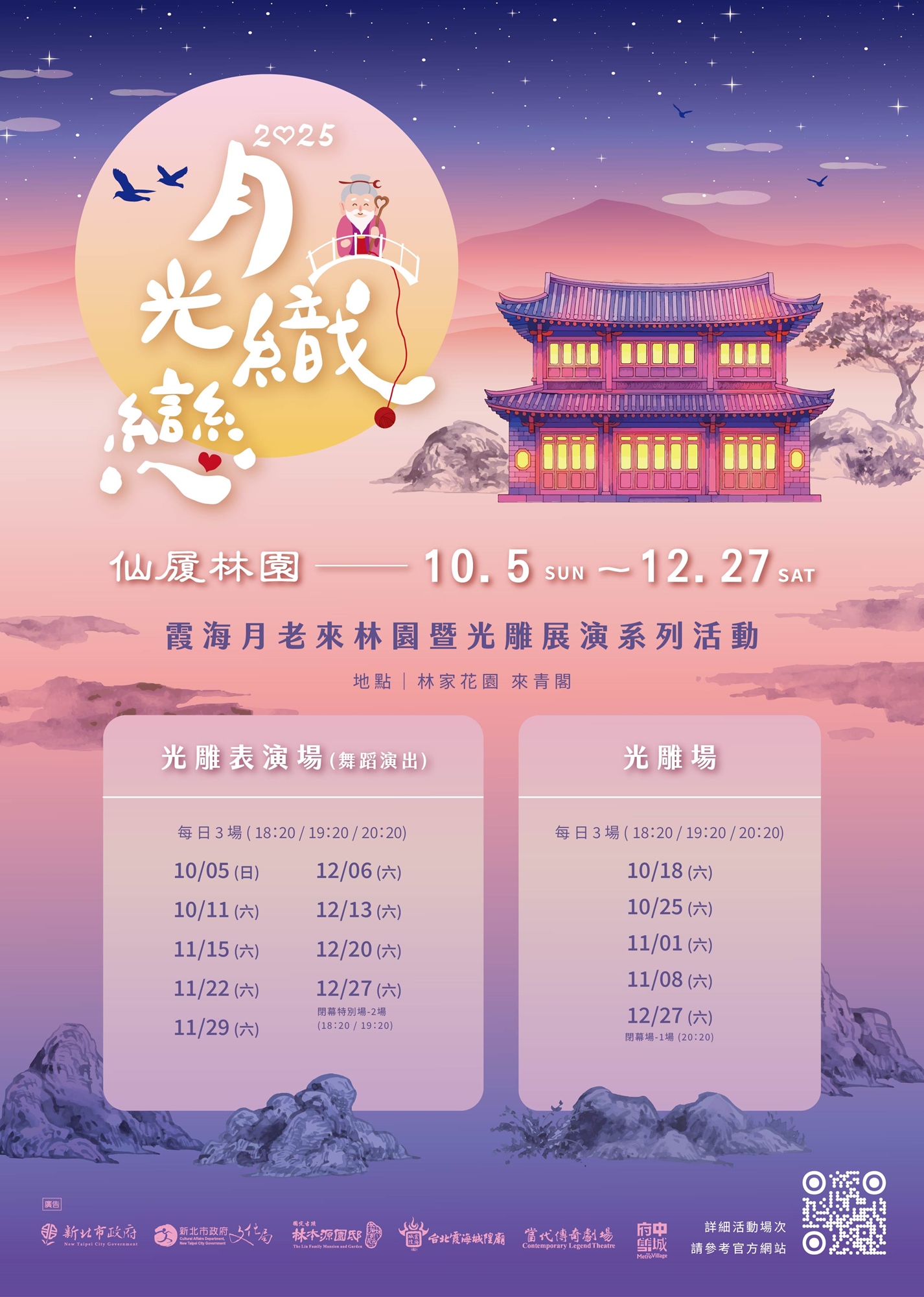 「月光織戀 仙履林園」光雕展演,以來青閣為舞台,巧妙融合經典的牛郎織女傳說,由「光點吉樹」團隊打造浪漫光影藝術。光雕結合林家花園獨特的園林造景與吉祥紋樣,透過五幕光影敘事,宛如愛情篇章,細膩描摹「仙履林園」主題,再現古蹟的詩意與浪漫。