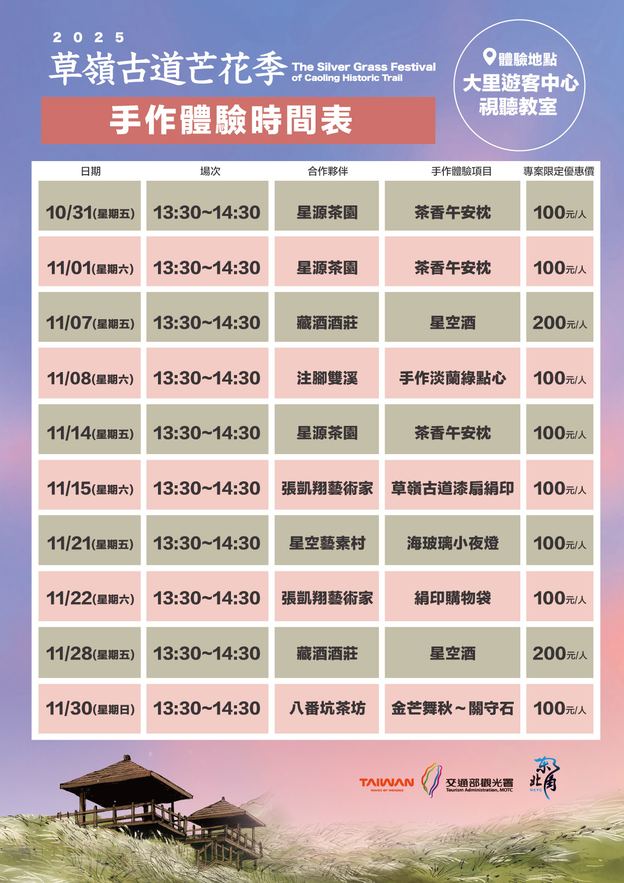 來到大里遊客中心,不可錯過亮點活動就是——「手作淡蘭點心」!由注腳雙溪帶來超療癒的 「柿柿如意南瓜糕 DIY」,不僅好玩可口,更是淡蘭飯包裡最吸睛的亮點。親手體驗,邊玩邊品味淡蘭古道的在地風味。