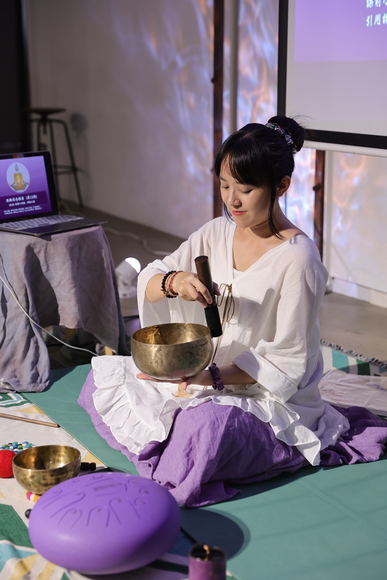 透過專業引導,一起在閉眼靜坐中,感受聲波流過身體的震動,將積累的緊繃與雜念慢慢釋放。