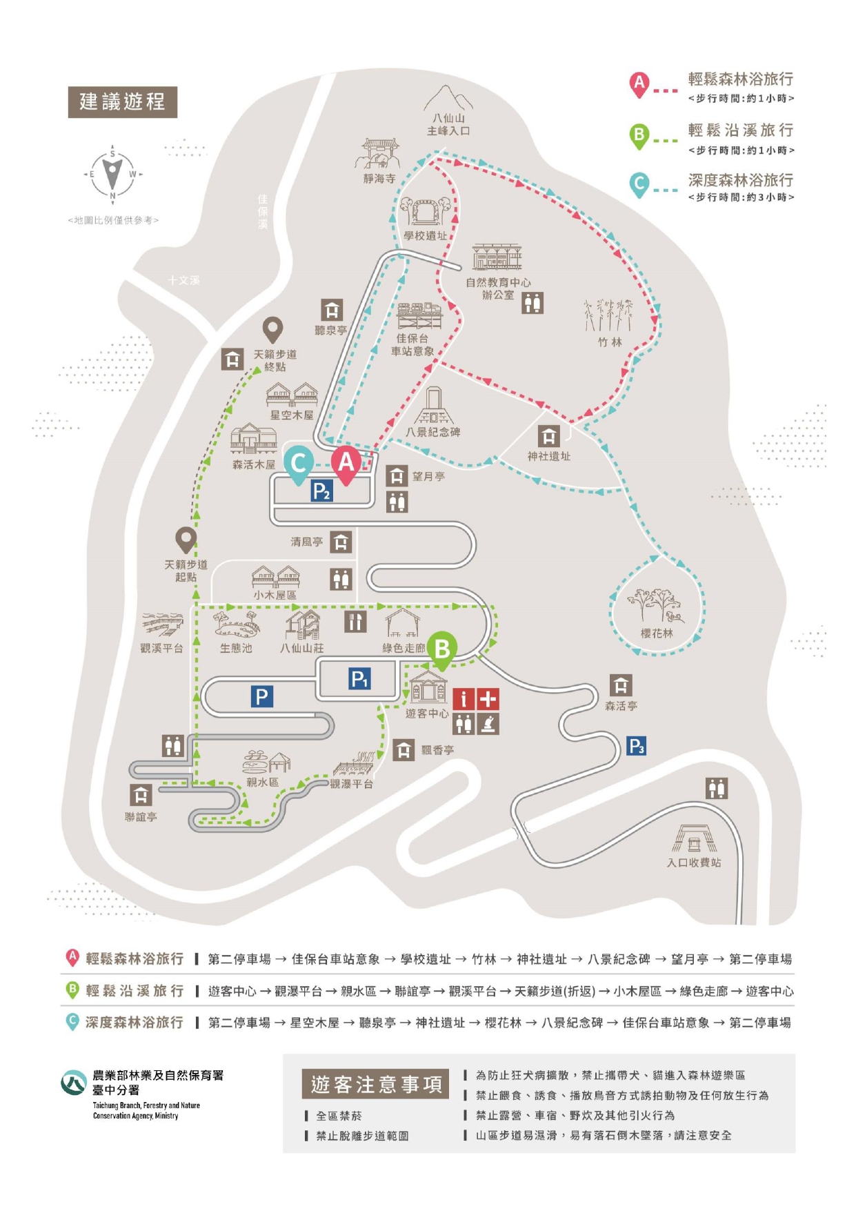 開車:國道4號(豐勢交流道下)→臺3線左轉,往東勢方向→經東勢大橋右轉進入臺8線、往谷關→經和平→臺8線33K至篤銘橋右轉→至八仙山國家森林遊樂區。