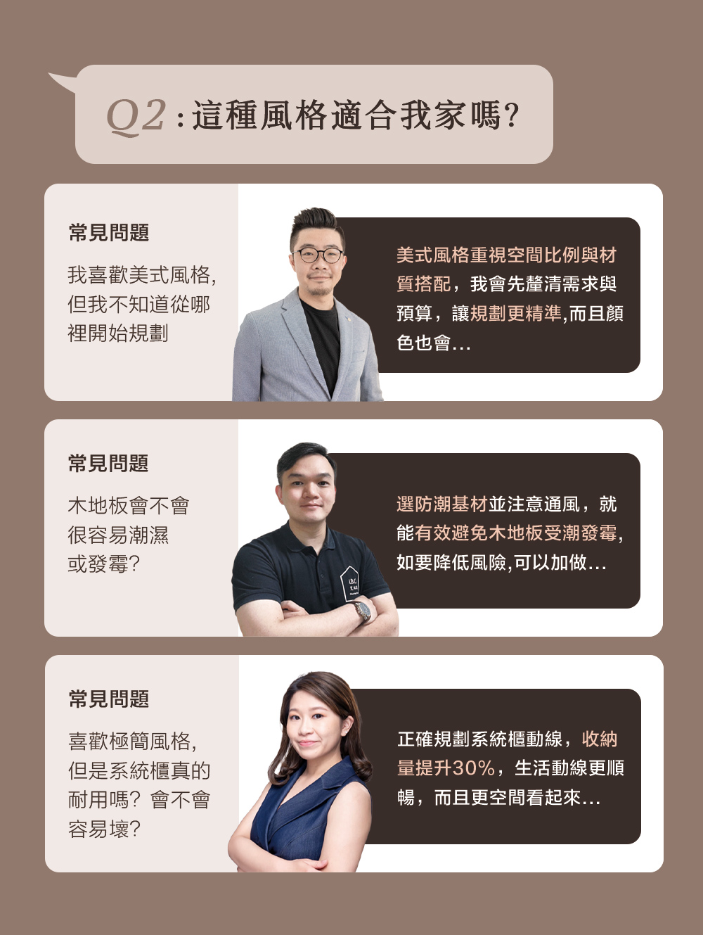 ➡️ Q&A 解答個人裝疑惑,並提供免費空間規劃諮詢,給你最貼近需求的建議。