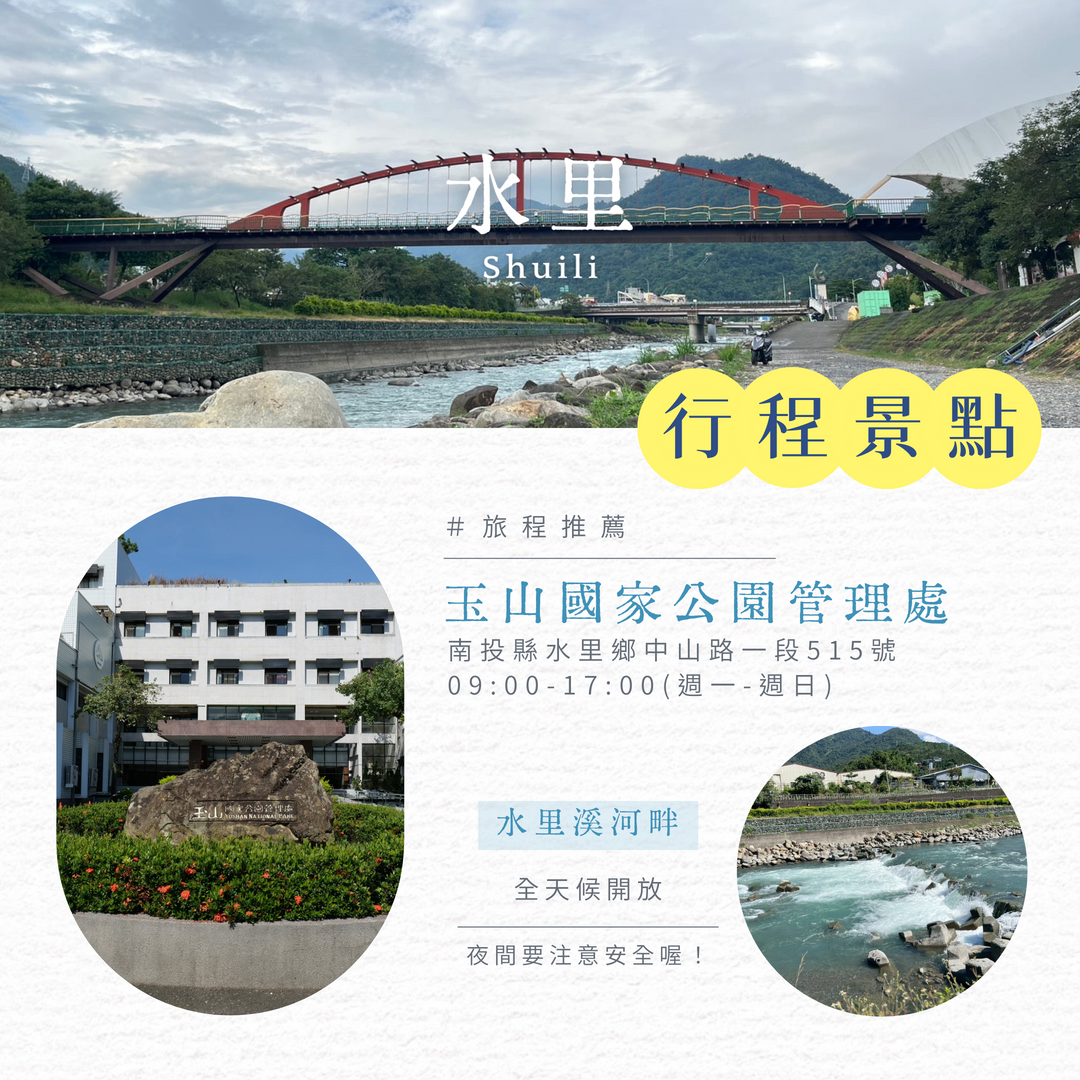 在水雲橋享用輕食補給,最後前往水里老街自由漫遊,品味地方人文與特色美食。