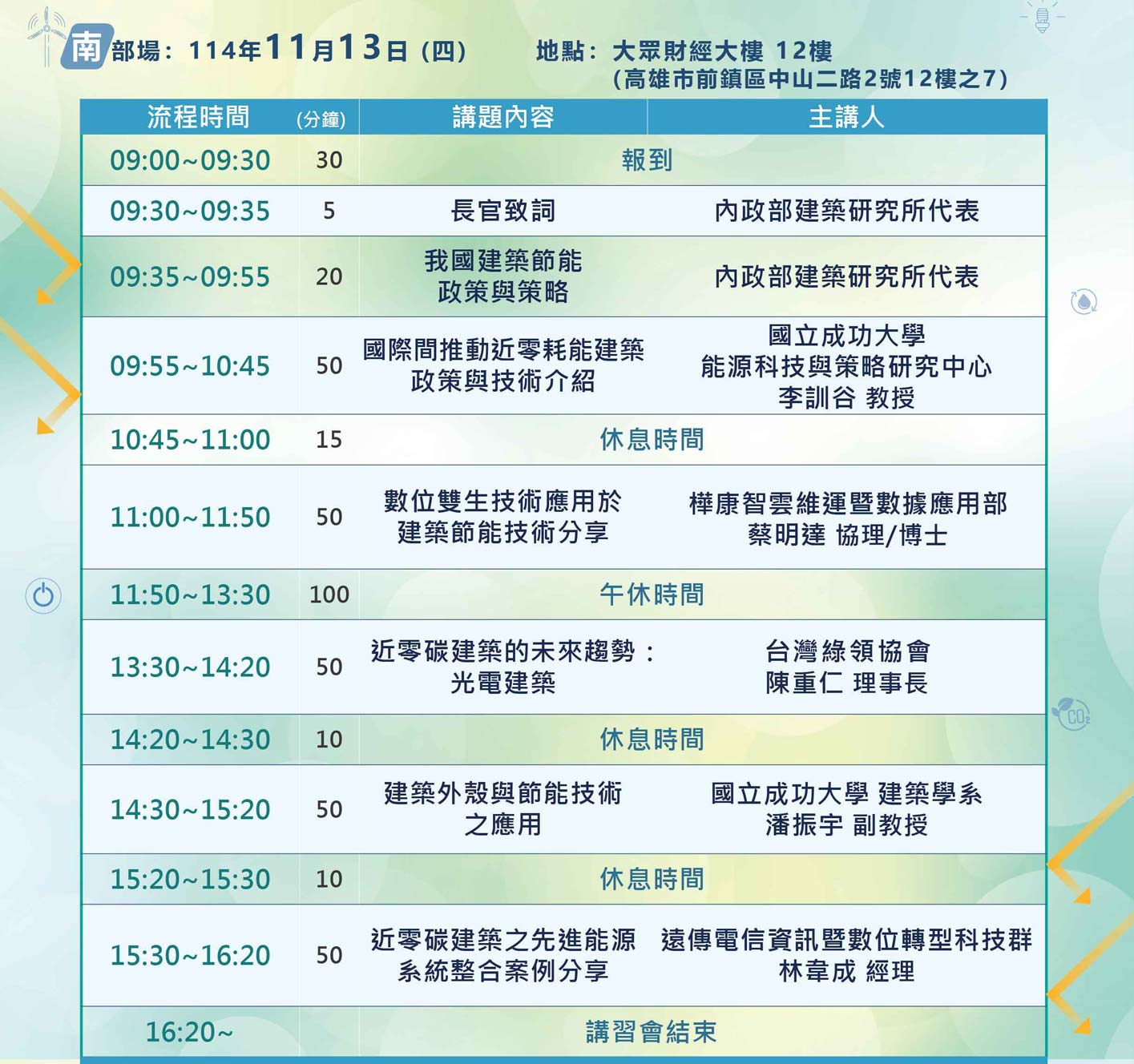 本講習會內容係針對政府機關及建築相關產業從業人員,能更加了解建築節能技術與應用,並彙整出三大建築節能主題,分為「國內外建築節能相關政策與趨勢」、「國內外建築節能技術與應用及案例分享」以及「建築導入光電系統之應用」,有關主題安排如下: