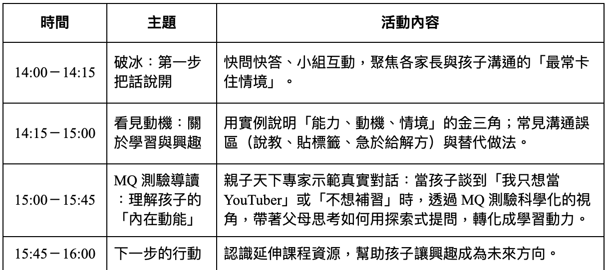 現在的時代,光靠分數與社會期待,已不足以幫助孩子找到方向。這場【興趣發展工作坊】專為青少年的父母設計:將透過「溝通心法」與「互動練習」,搭配「親子天下專家」的分享,讓父母學會如何理解孩子的性格特質、溝通孩子的興趣,並引導他們將興趣轉化為行動。