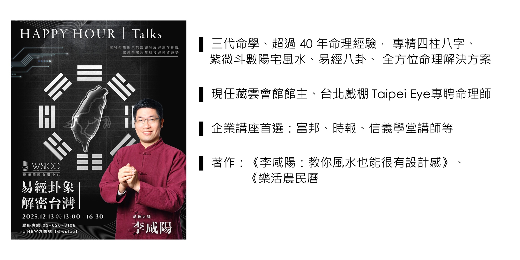 本次講座將由易經專家-李咸陽 大師,帶您運用古老的智慧,為事業決策提供高屋建瓴的參考