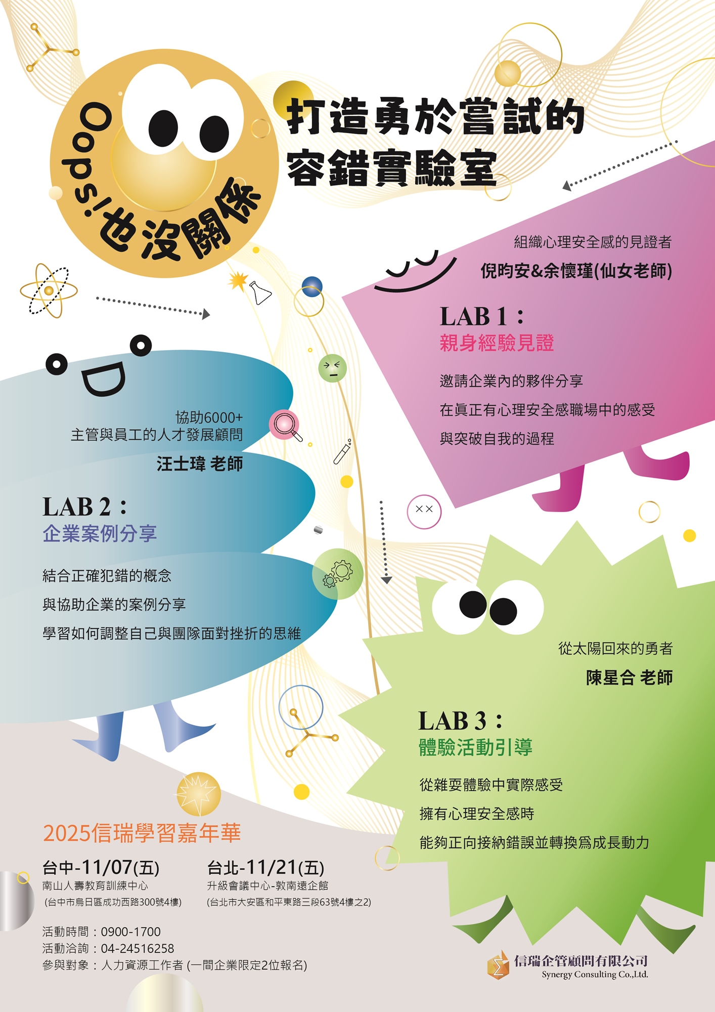 2025年信瑞學習嘉年華【Oops! 打造勇於嘗試的容錯實驗室】,與你一起探討組織成長與創新的過程中,「心理安全感與正確犯錯」帶來的影響及重要性。