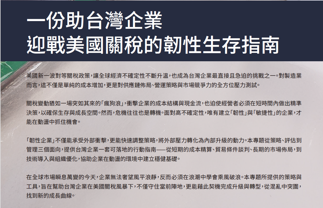 全新【關稅生存攻略系列】將從「營運決策」、「應戰工具」、「後援補助」三大面向,提供完整的突圍全攻略,希望幫助台灣企業在關稅風暴下,不僅守住當前陣地,更能藉此契機完成升級與轉型。