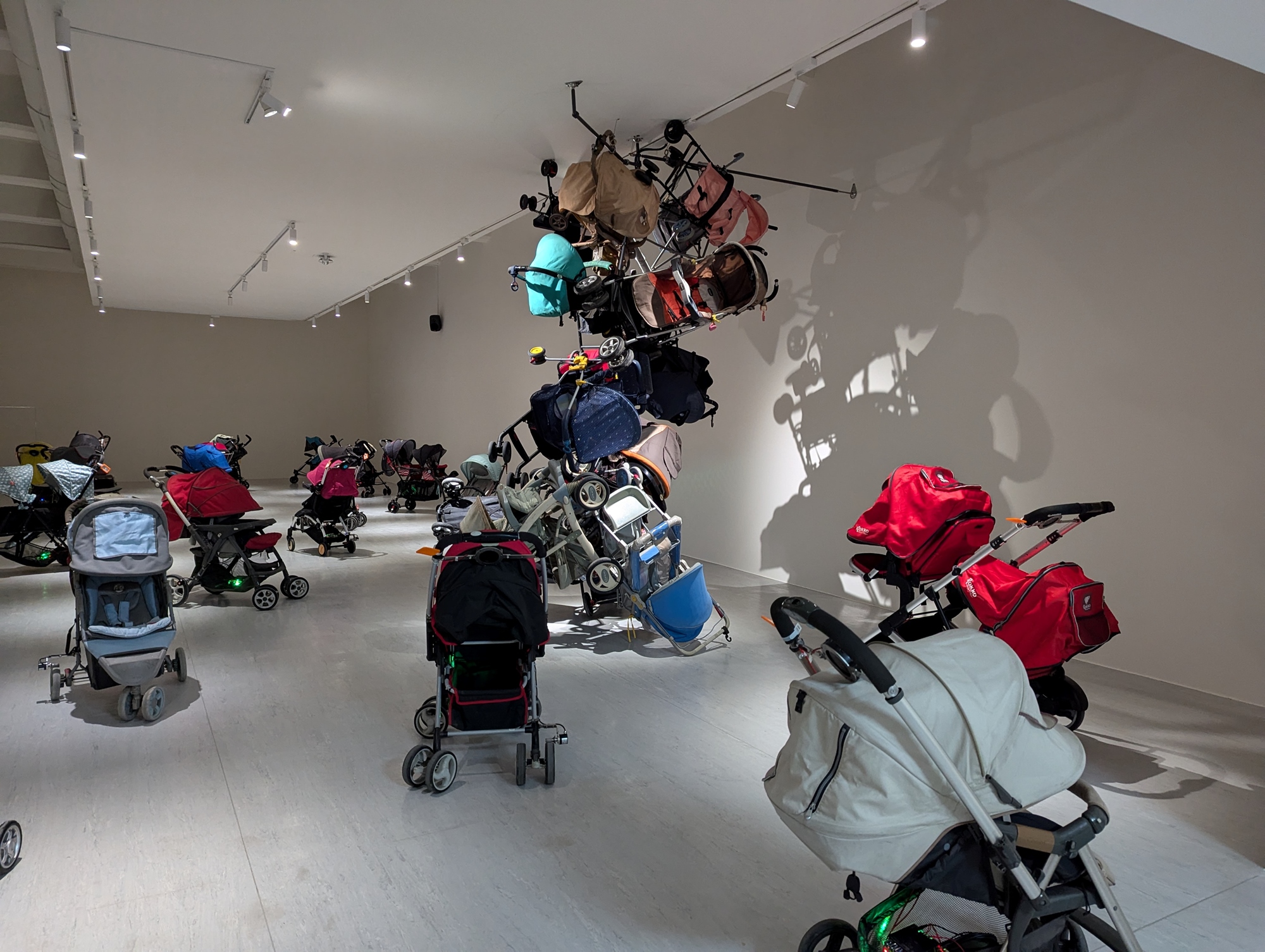After Russia invaded Ukraine in 2022, 109 baby strollers were placed on the Rynok Central Square in Lviv, as a commemoration for the 109 children who lost their lives in just 23 days. This event titled The Price of War became the starting point for the large installation Between II which was presented at the Taipei Fine Arts Museum in 2024. Centered around one hundred baby strollers collected from across Taiwan, the work combines mechanical power, human-machine interaction, and sound art.