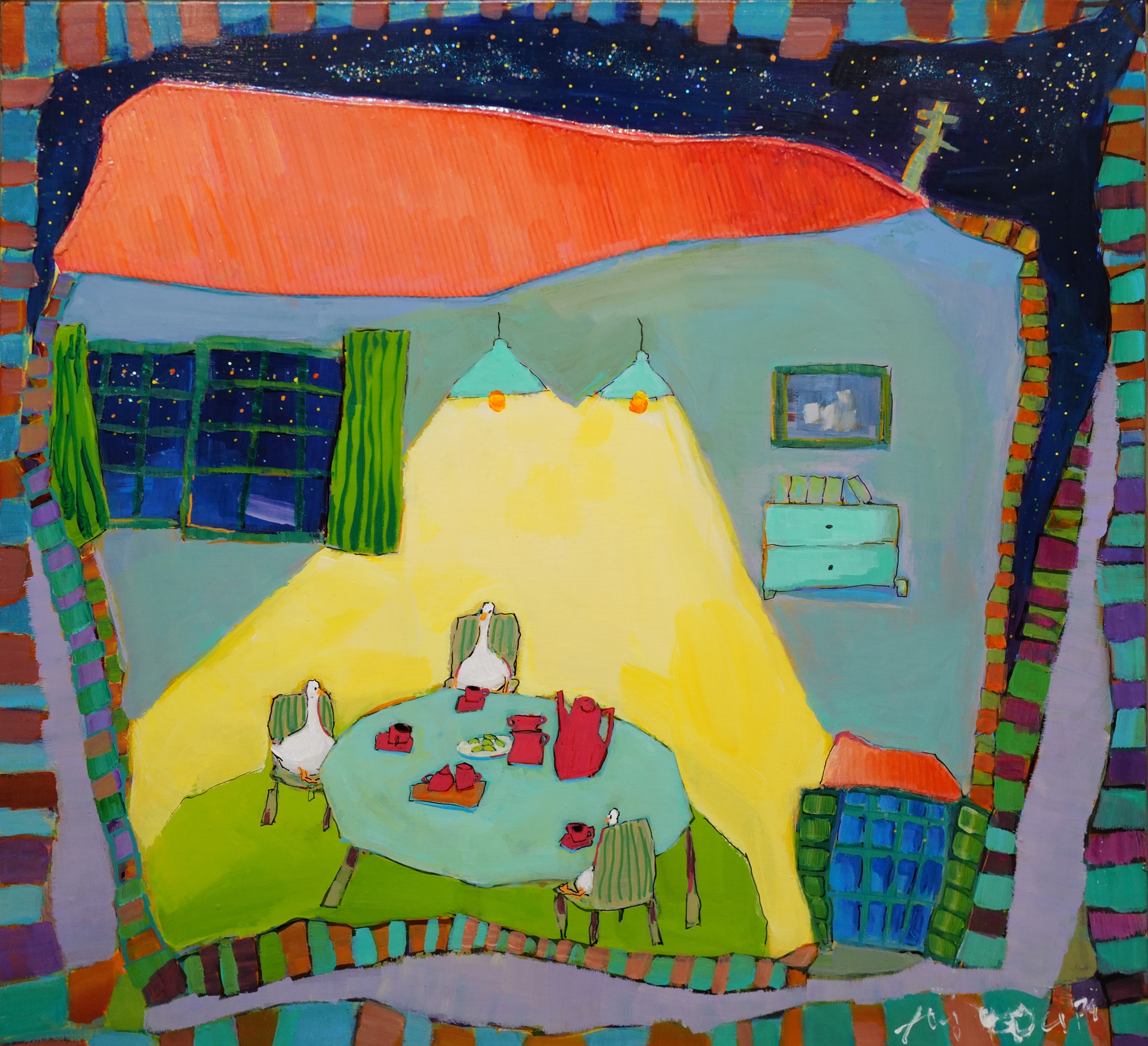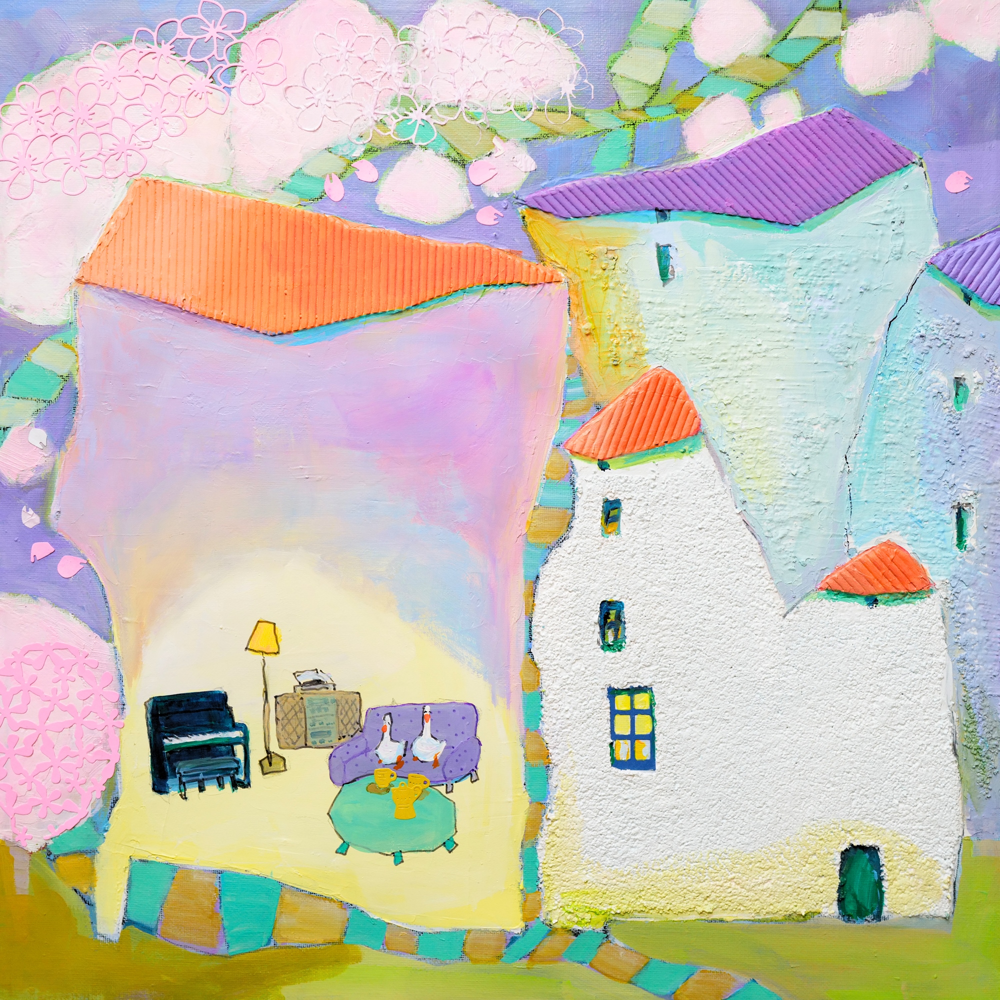 Enjoying a cup of tea together, a mother awaiting her child from school, wandering the streets of the city during a quiet night — the everyday moments create the fabric of our beautiful lives and connect us to one another. Her art evokes a sense of nostalgia, whimsy and belonging with her pastel colors of the landscape of her hometown Busan, alongside simple scenes of home life between families of geese. These feelings echo Lim's artistic philosophy: "I hope I can create work that moves along with the smallest, the lowest, and the most hurt." In this big world, we can all feel small at times, and Lim reminds us our lives are magical just by existing. Her charming, crooked alleyways and winding staircases aren't just artistic choices; they're metaphors for life's journey, showing us that it's often the unexpected turns that lead to the most meaningful connections.