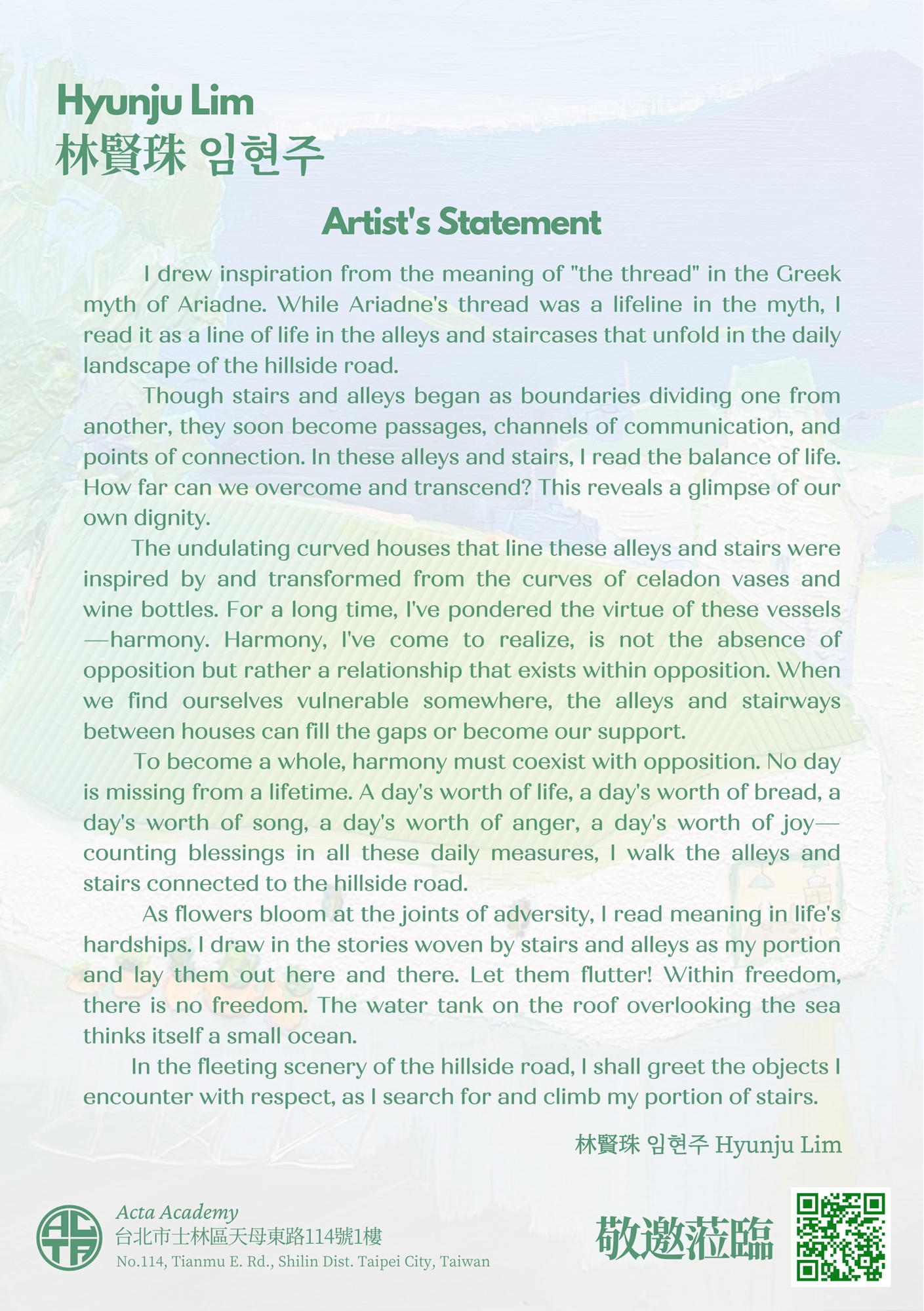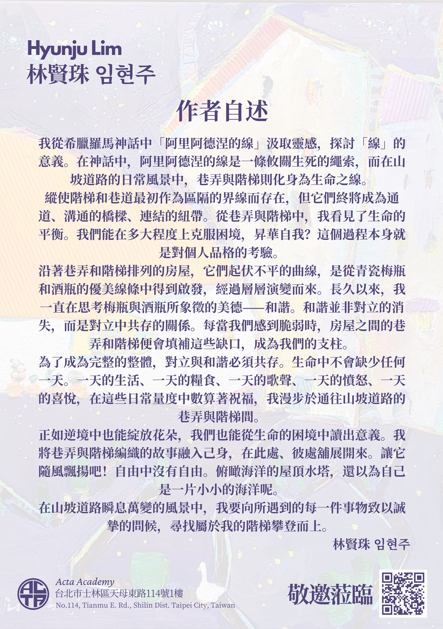 We are happy to announce the 2nd solo exhibition by Artist Hyunji Lim in Taipei! After an extremely positive response from Hyunju’s first solo exhibition, we are so excited that Ms. Hyunju will be coming again to Acta Academy!