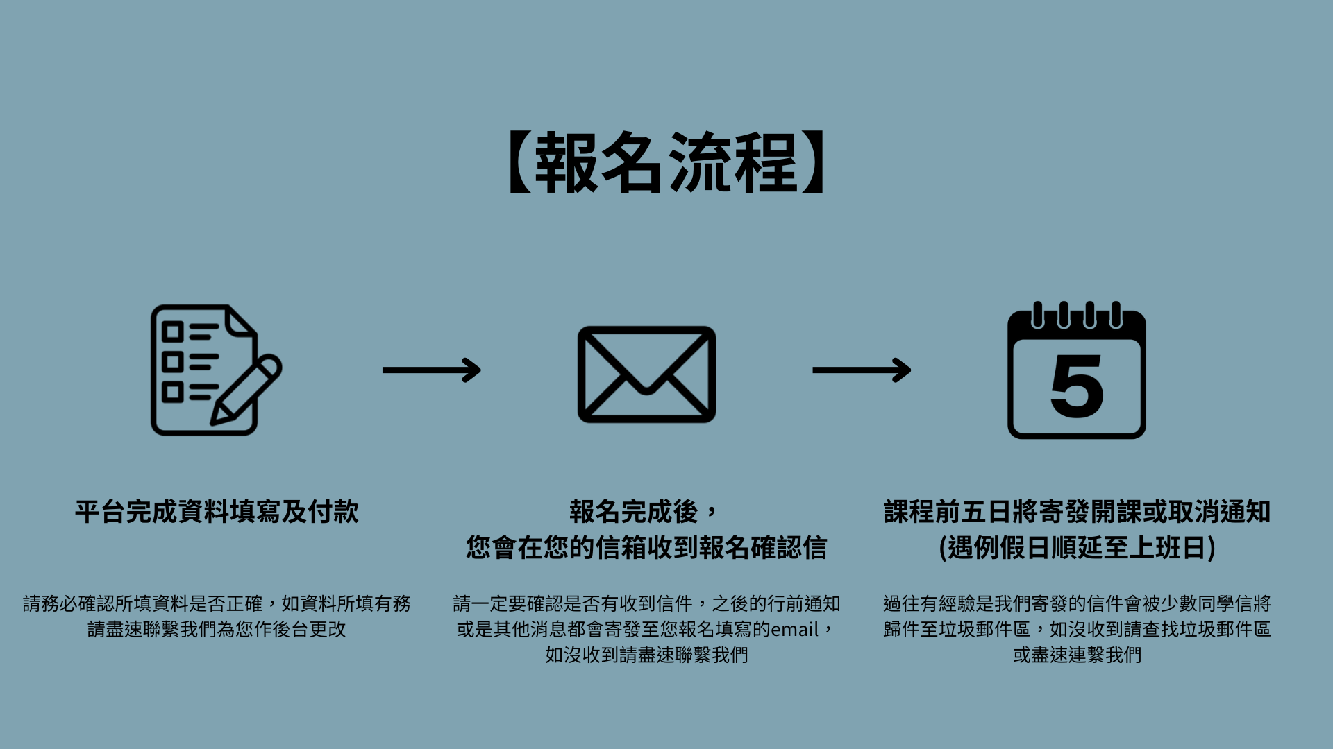 3. 報名後請完成繳費,才算報名成功;若繳費期限內未完成繳費者,報名將於繳費期限到期時取消。