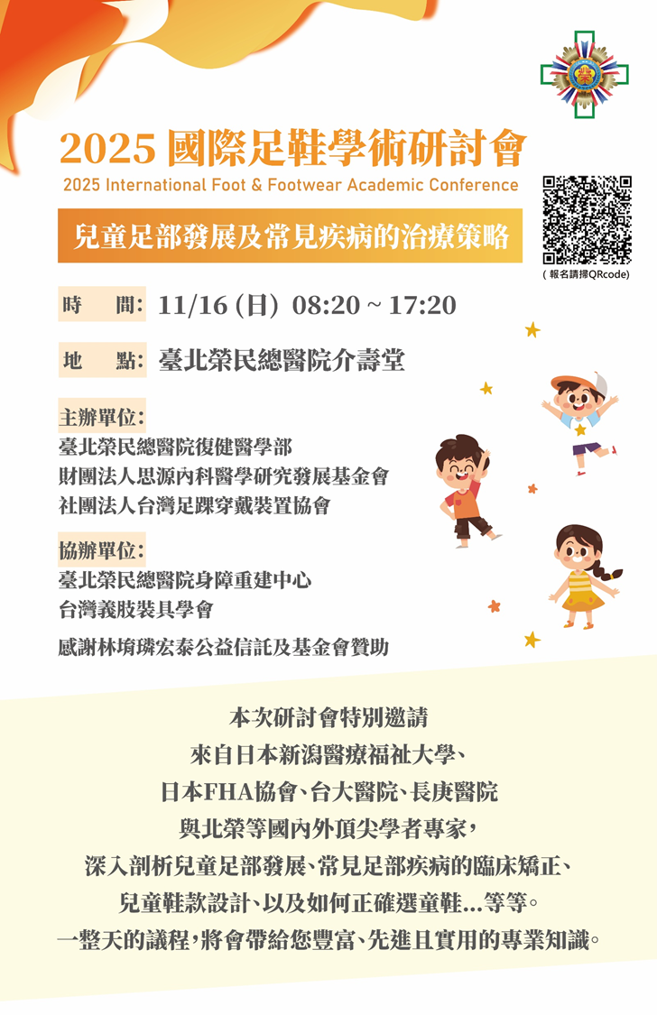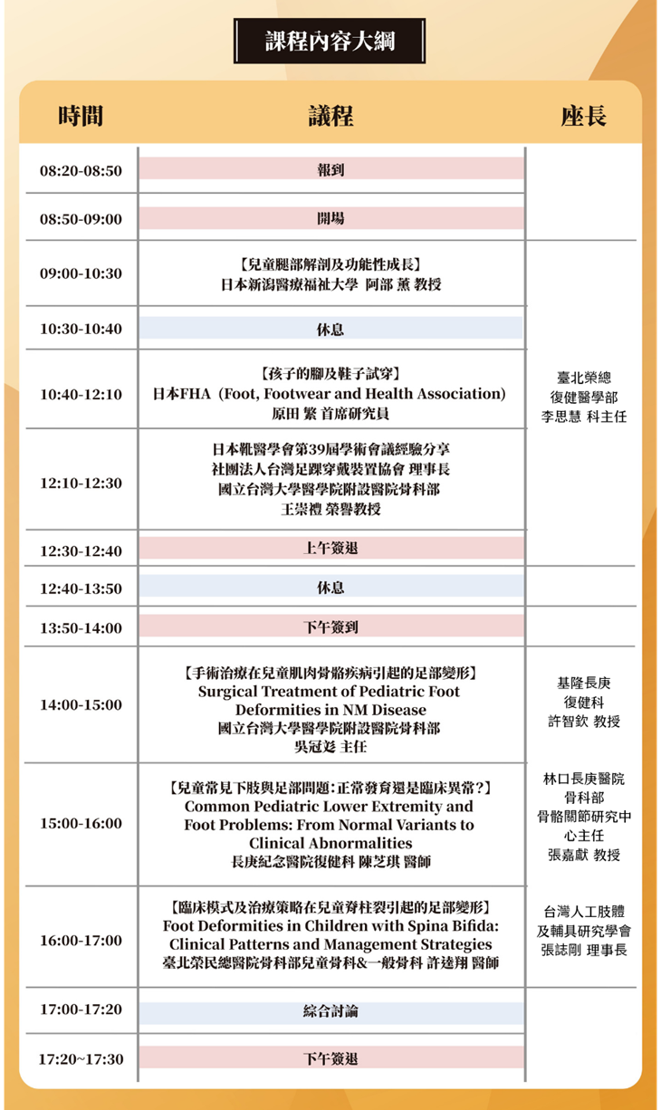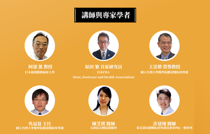 本次研討會特別邀請來自日本新潟醫療福祉大學、日本FHA協會、臺大醫院、長庚醫院與北榮等國內外頂尖學者專家,深入剖析兒童足部發展、常見足部疾病的臨床矯正、兒童鞋款設計、以及如何正確選童鞋…等等。一整天的議程,將會帶給您豐富、先進且實用的專業知識。
