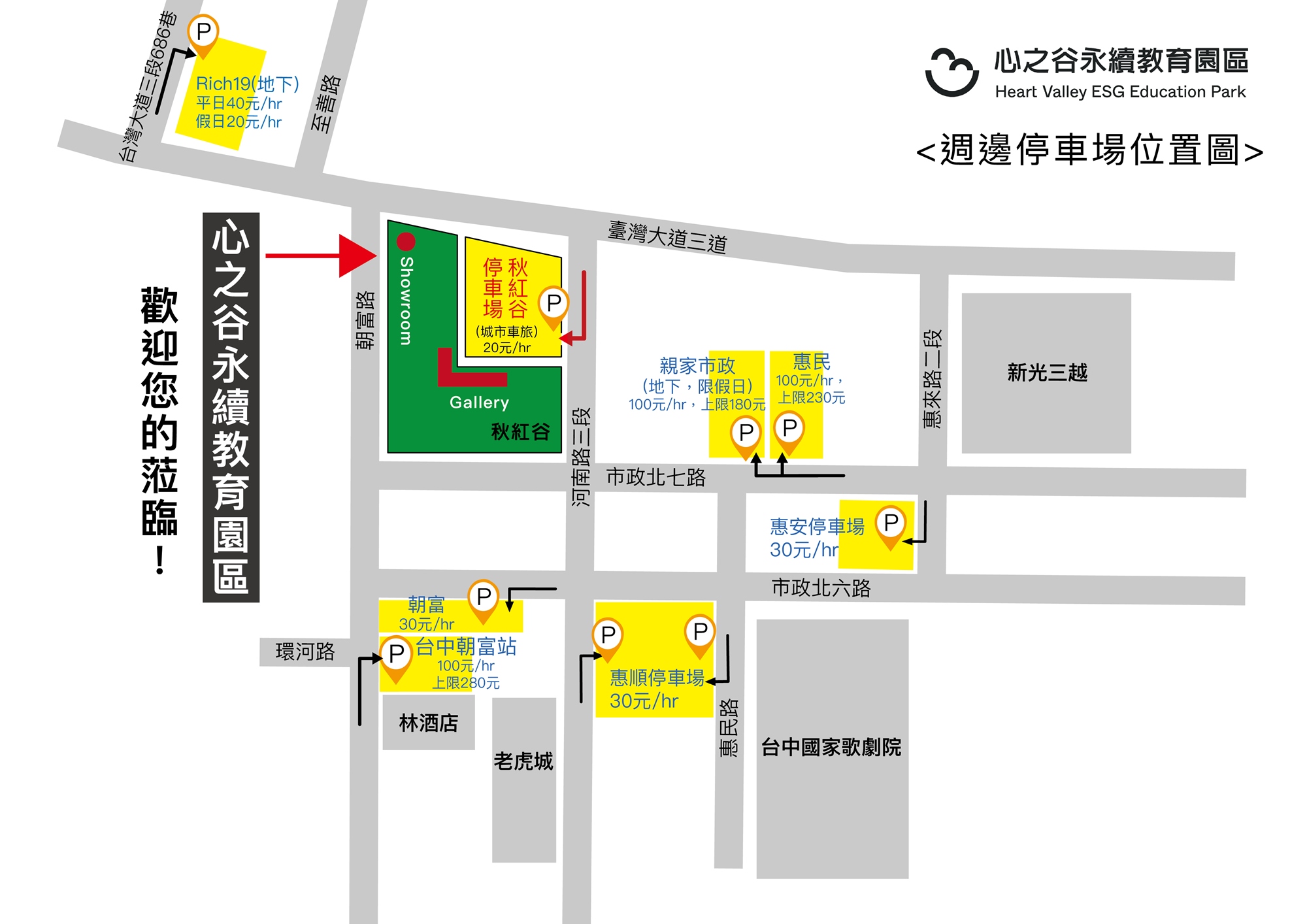 行駛國道1號(中山高)由台中交流道(台中/沙鹿)出口下交流道,直行臺灣大道(台中港路)約3分鐘即可抵達。