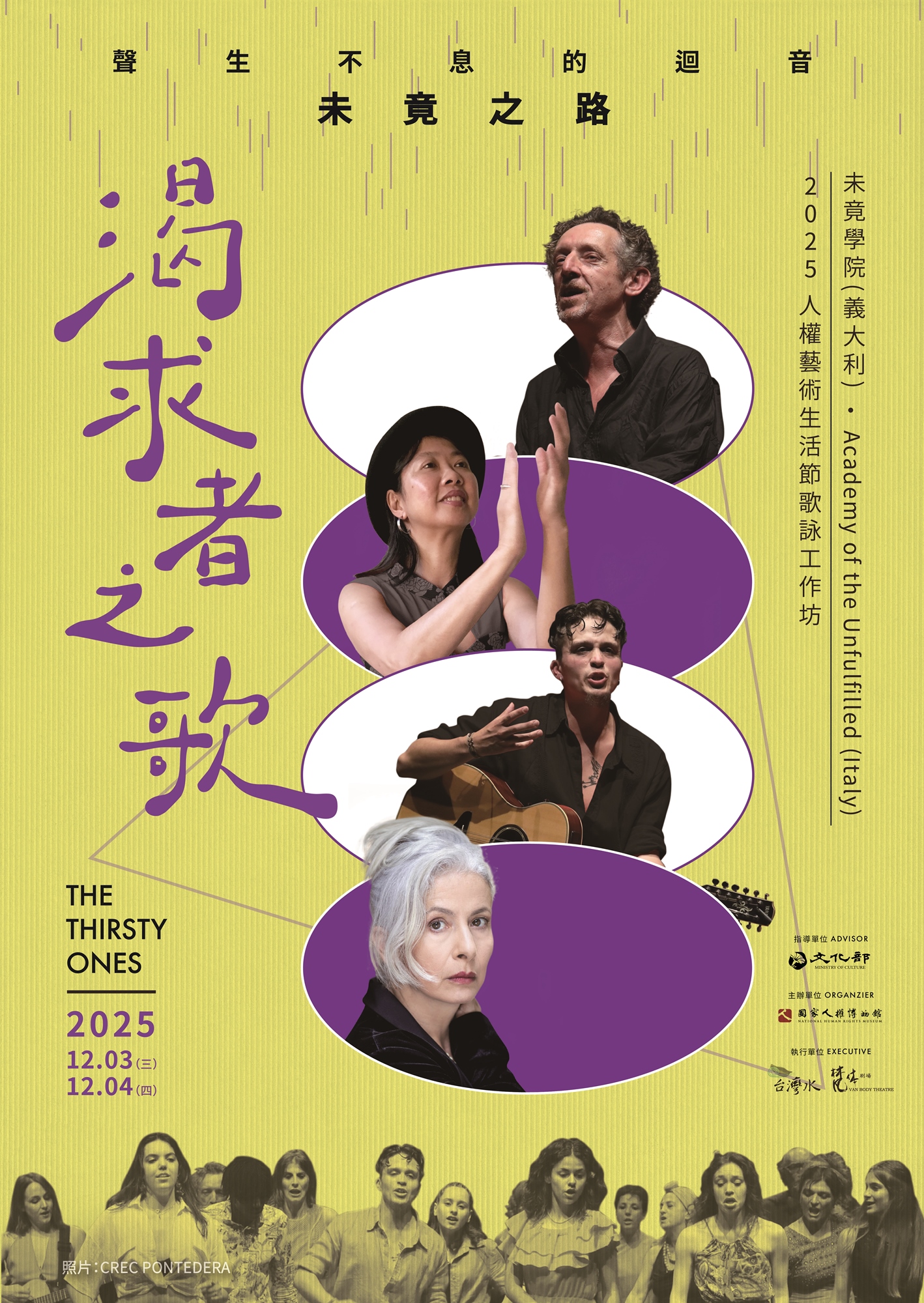 義大利「未竟學院」(Academy of the Unfulfilled)帶來歌詠工作坊《渴求者之歌》(The Thirsty Ones),本工作坊由國際知名戲劇導演與教育家馬里歐·比亞吉尼(Mario Biagini)親自帶領,將透過歌詠的形式,帶領參與者在集體詠唱中體驗音樂、文化與劇場的交融。