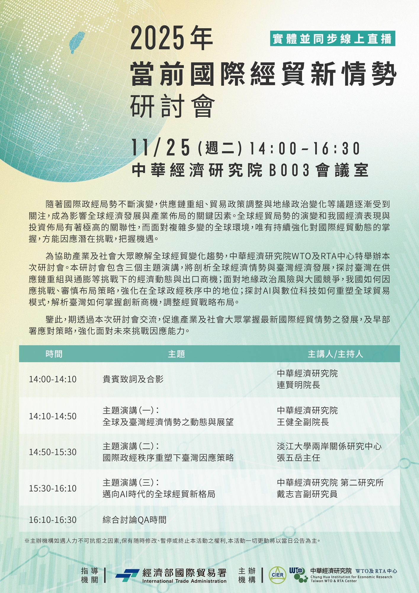 【個資同意書】中華經濟研究院向您蒐集之個人資料(包含個人姓名、公司名稱、職稱、電話及電子郵件地址等得以直接或間接識別個人的相關資訊),將僅限使用於本次研討會,期限自聯繫起始日至特定目的(指本次研討會/課程)終止日為止,並遵守「個人資料保護法」之規定妥善保護您的個人資訊,除蒐集之目的涉及國際業務、研究或活動外,本院僅於中華民國領域內使用。於此前提下,您同意本院得於法律許可之範圍內處理及利用相關資料以提供資訊或服務,但您仍得依法律規定之相關個人資訊權利主張如下事項:查詢、閱覽、複製、補充、更正、處理、利用及刪除,請以電子郵件向本院聯繫,