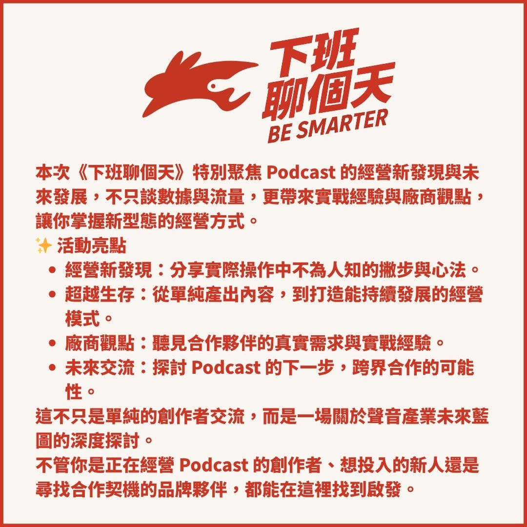 本次《下班聊個天》特別聚焦 Podcast 的經營新發現與未來發展,不只談數據與流量,更帶來實戰經驗與廠商觀點,讓你掌握新型態的經營方式。