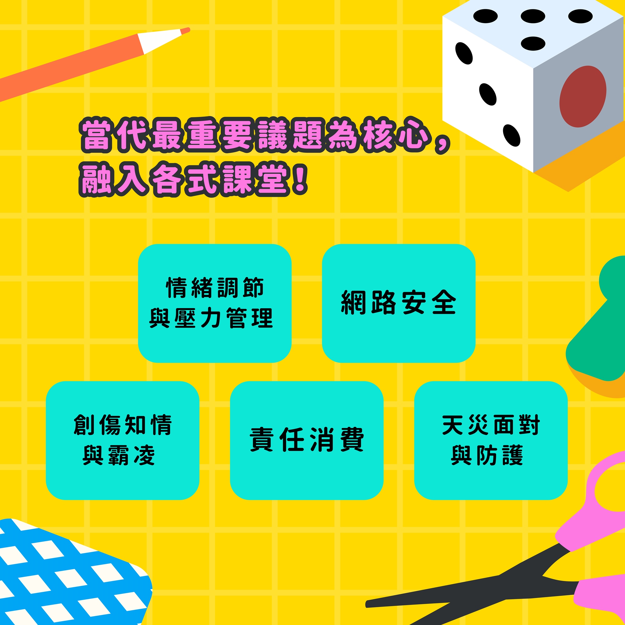 實作將以當代最重視的情緒調節、網路安全、創傷知情與霸凌、責任消費、天災面對等主題進行分組操作,方便老師們未來將製作成果融入課堂,一起創造有趣又有意義的課程!