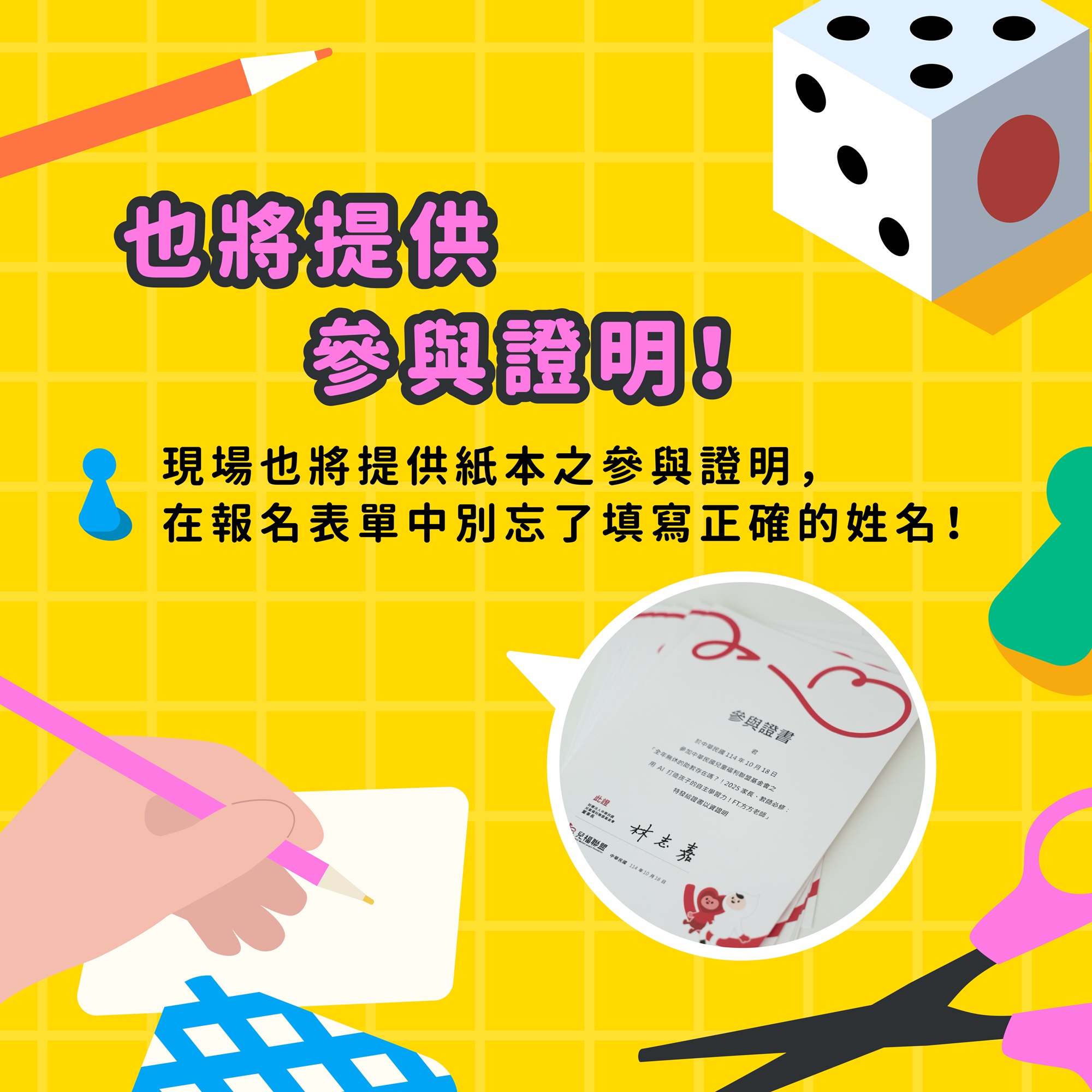 🧾參與證明:本場活動將提供於現場完整參與者紙本之參與證明,敬請於報名表中填寫參與證明文件中所需填寫之姓名。