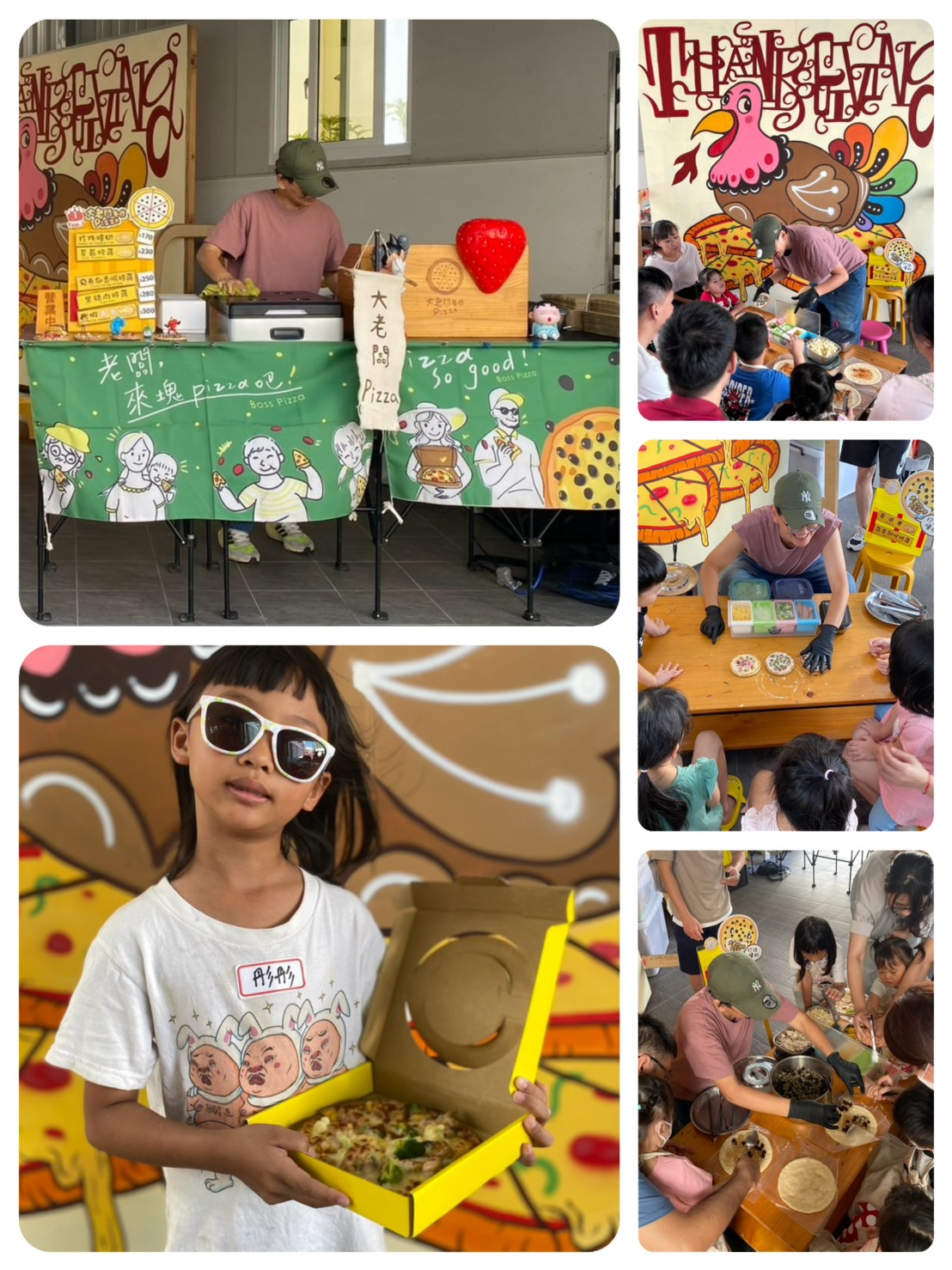 Anna先藉由音樂、繪本、遊戲互動帶入感恩主題,五感派對開放式玩耍,接著由來自嘉義市區的「大老闆手作披薩」的大老闆帶領孩子製作手工披薩,色香味俱全,開啟每個感官體驗!