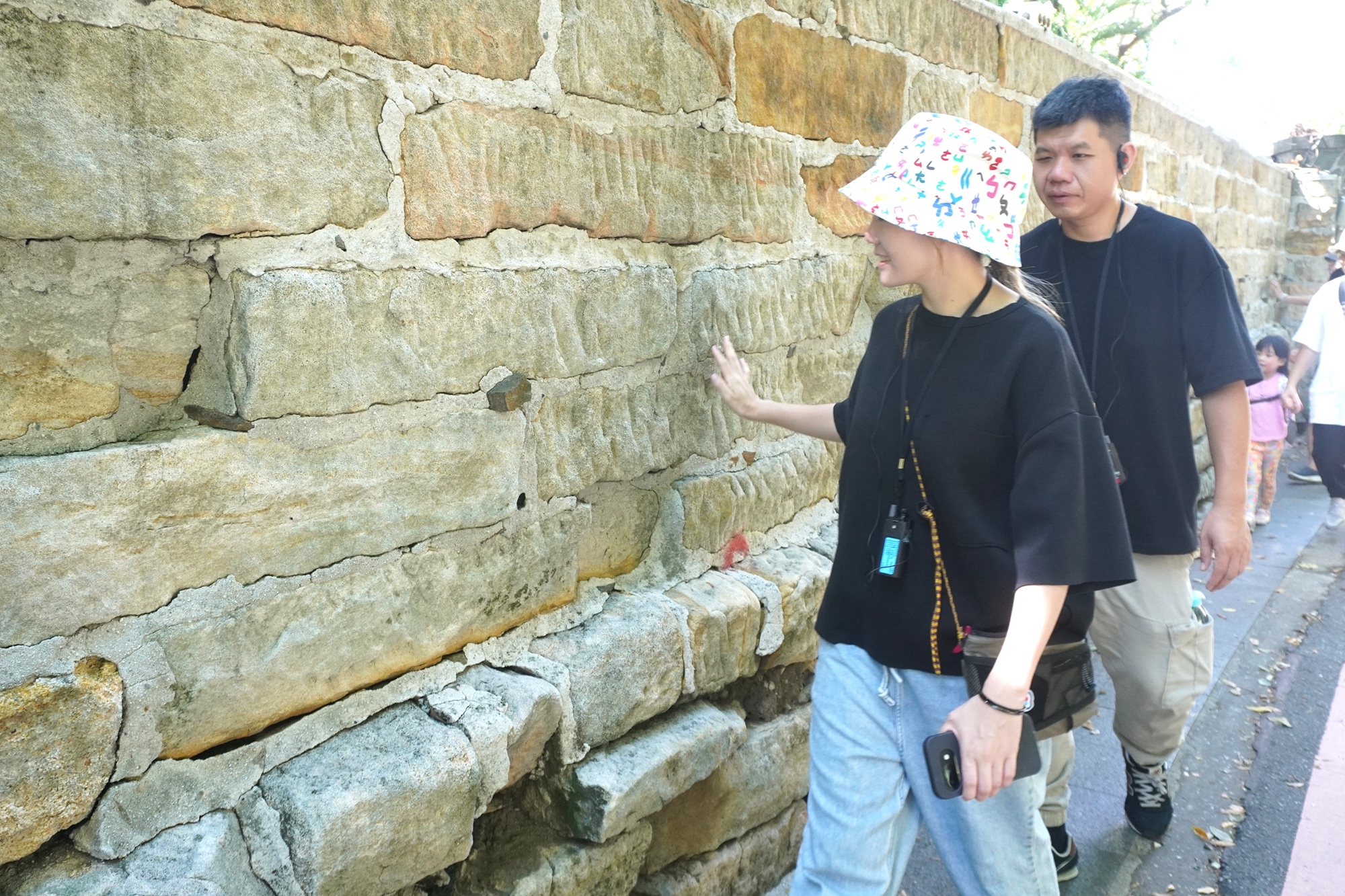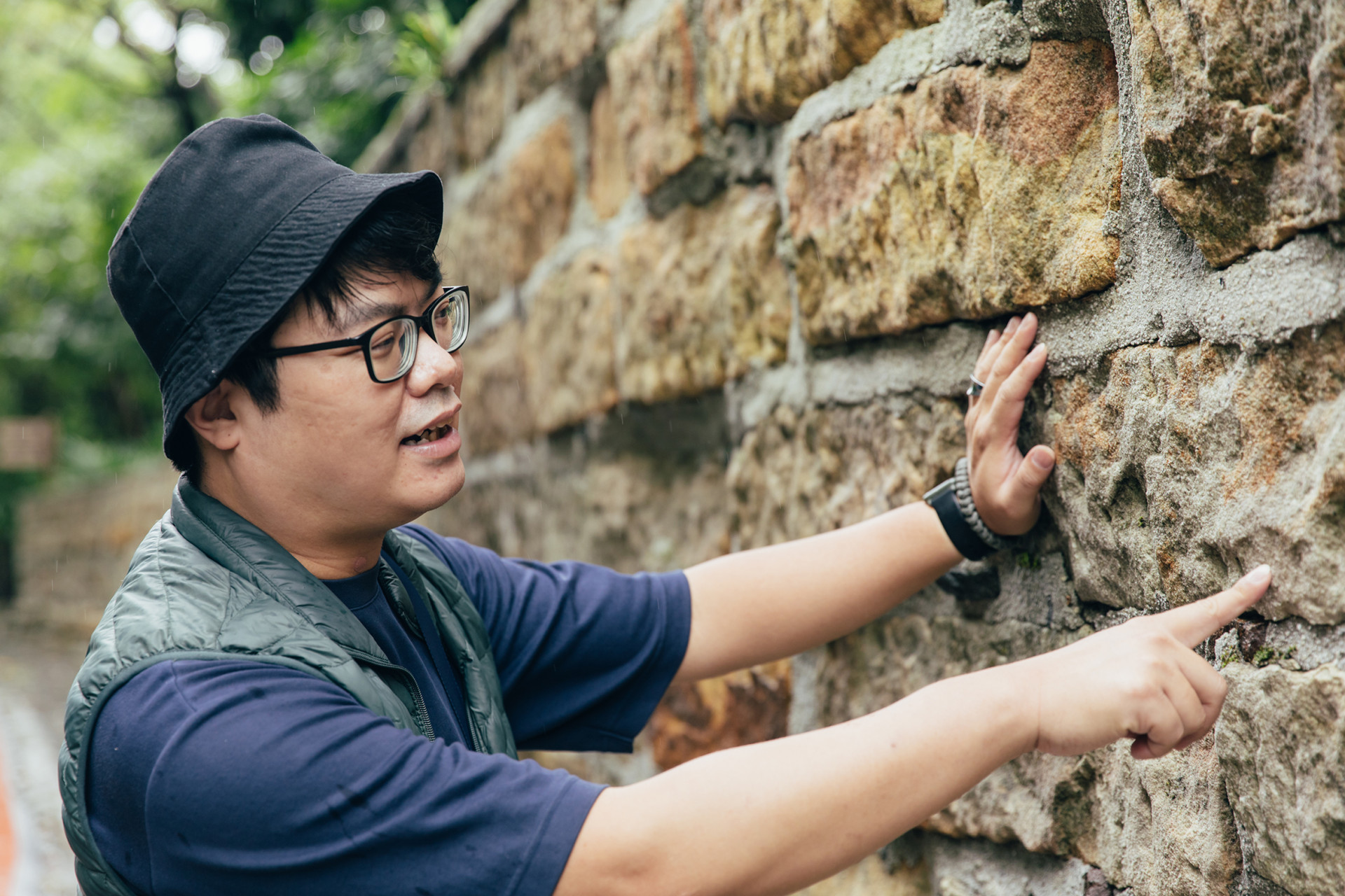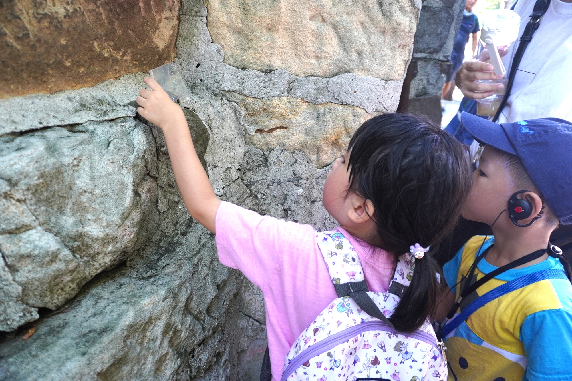 ▲觸摸石材的紋理,認識北投因火山地質形成的安山岩、還有砂石地質形成知名的唭哩岸石,以及一同探索享負盛名的北投石與在地關係