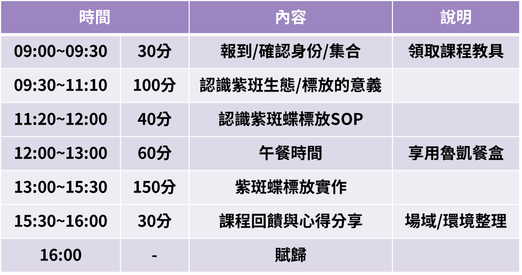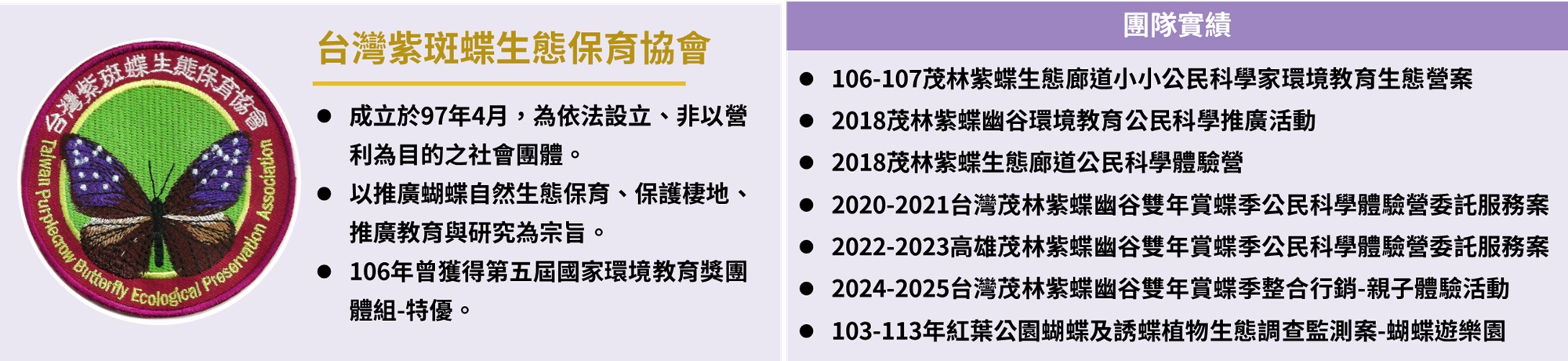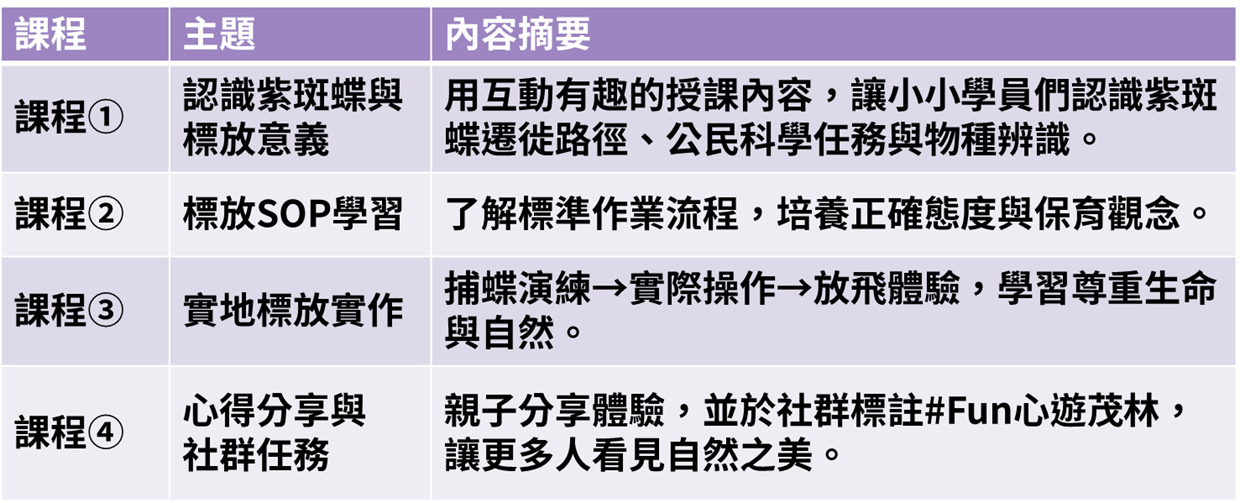 - 寓教於樂生態課程:認識紫斑蝶遷徙奧秘、學會辨識物種、理解公民科學精神。