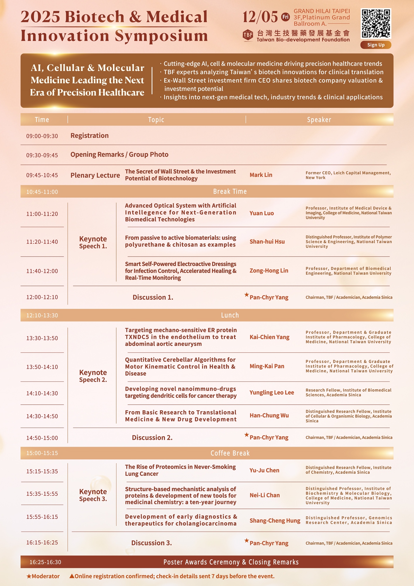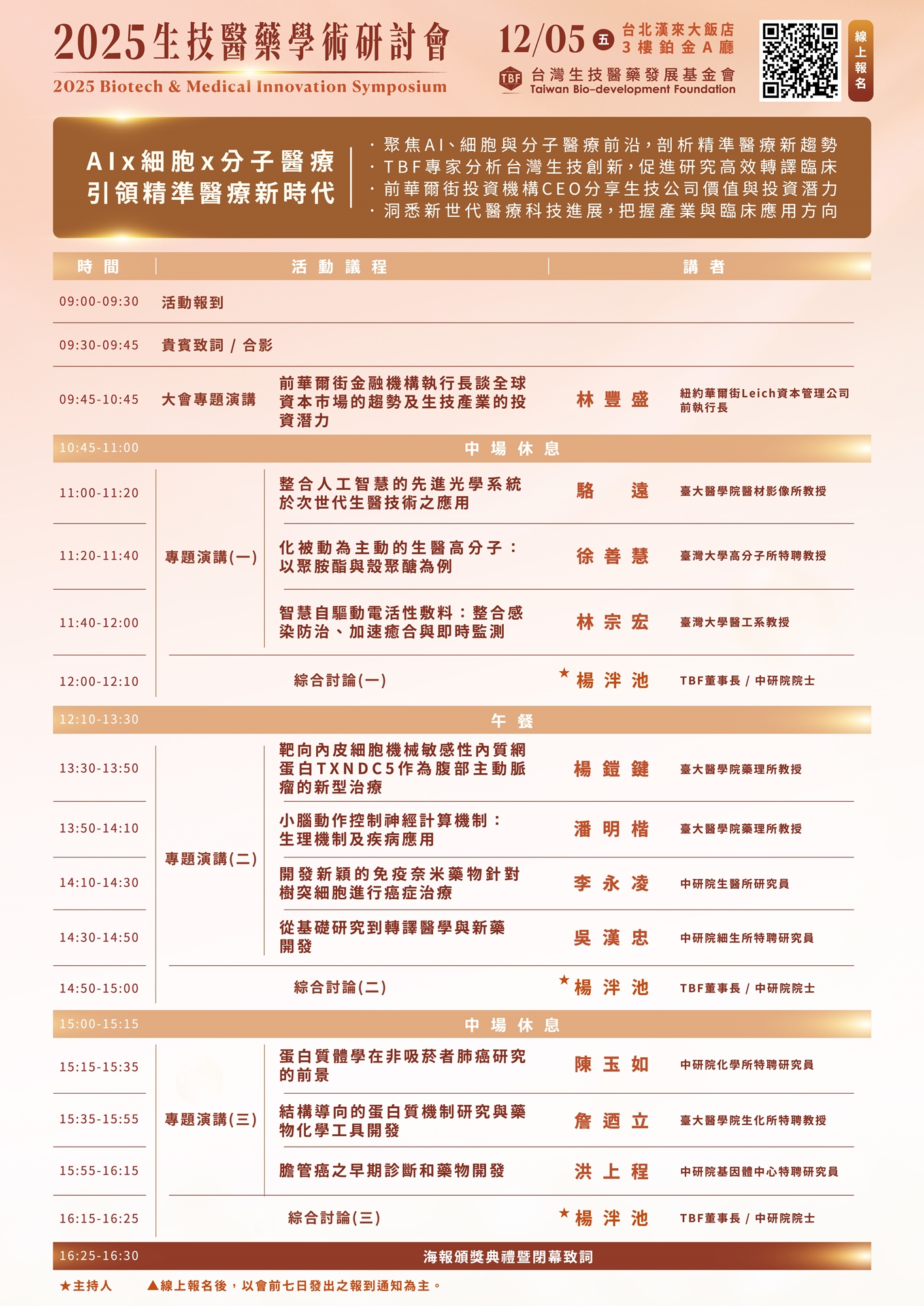 1.本研討會因座位有限,將以邀請貴賓及生技醫藥學術、產業相關專業人士為優先,本基金會保留審核權利。2.線上報名後,以會前7日發出之報到通知為主。3.研討會當天不提供現場報名。