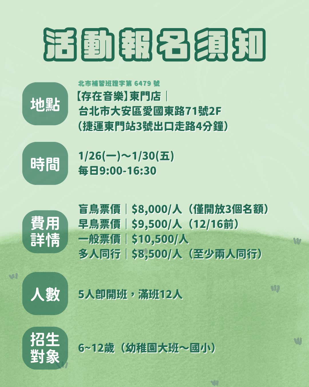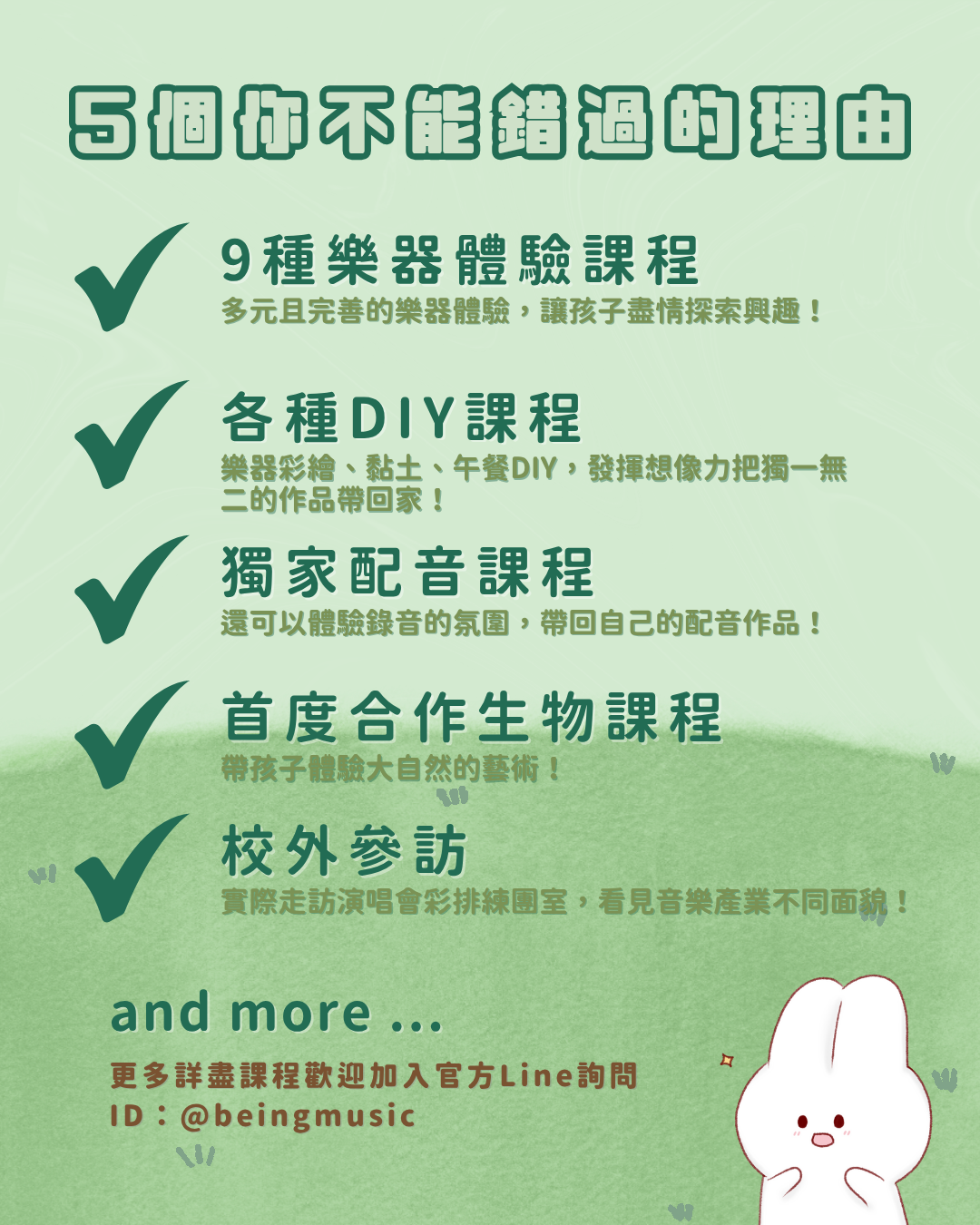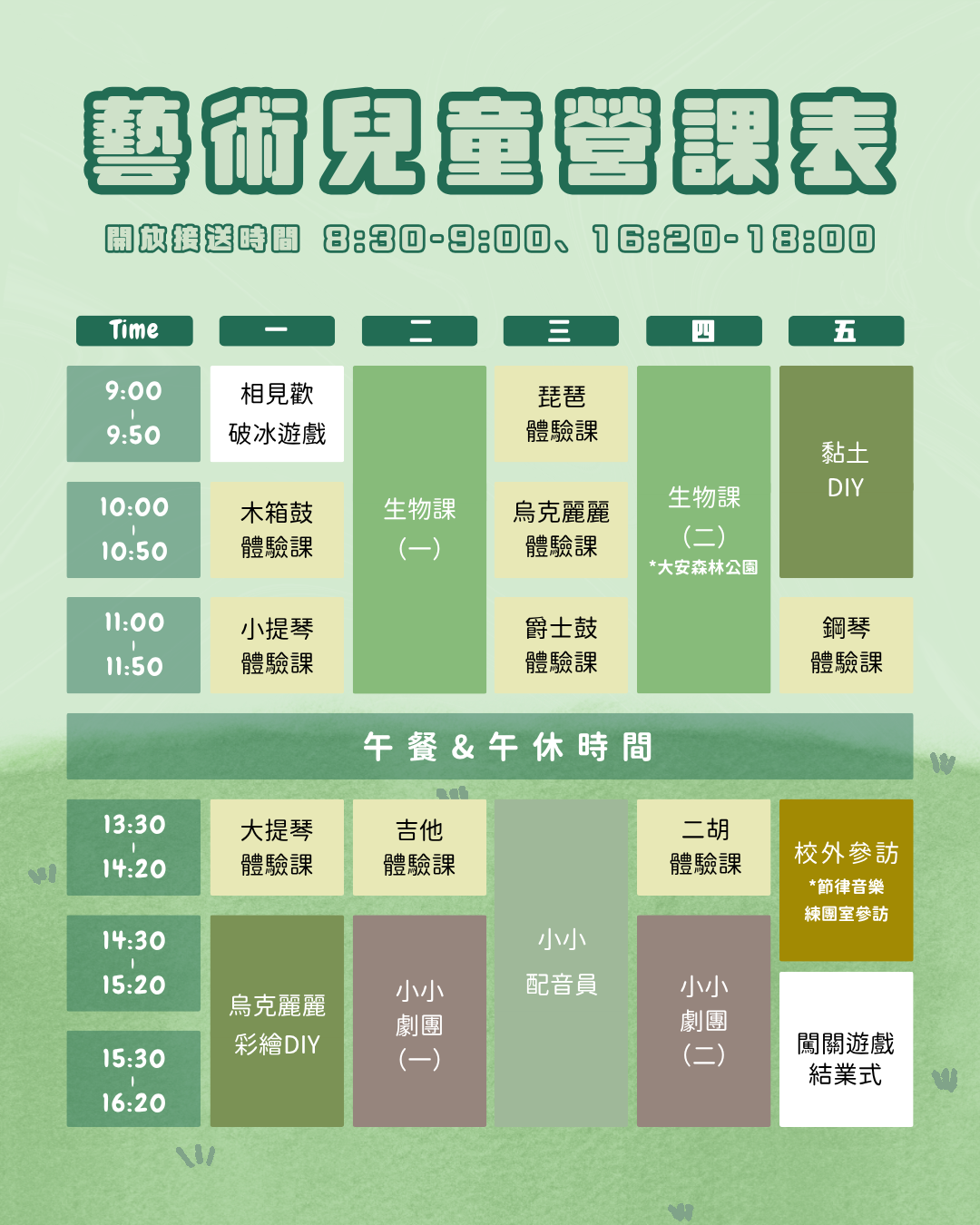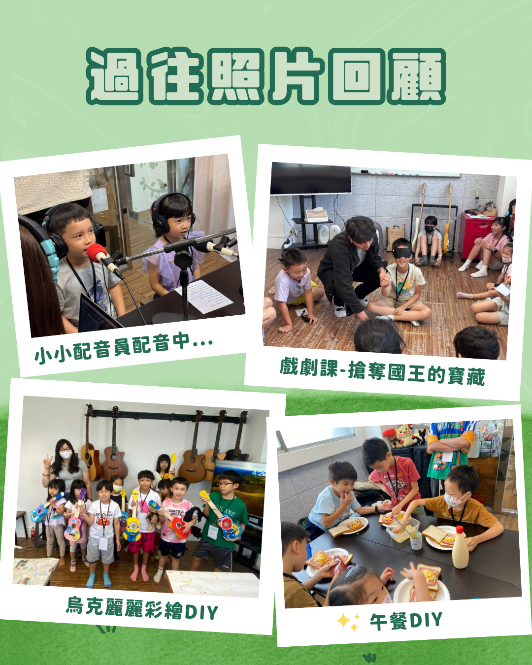 音樂×美術×戲劇×配音×生物×校外參訪,本次營期共5天,讓孩子豐富接觸多元藝術領域,發掘興趣!☺️