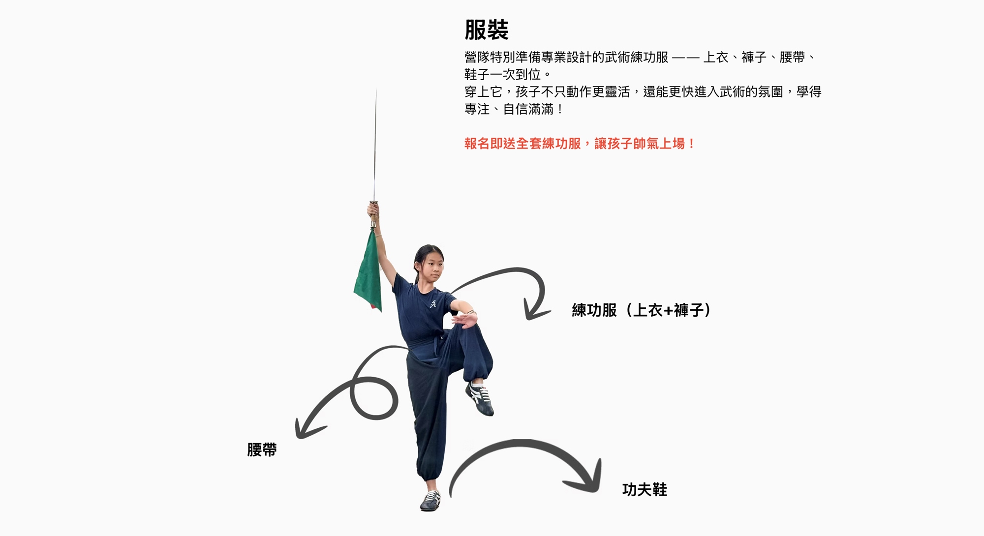 報名即送全套練功服,讓孩子帥氣上場!含功夫服裝一套、功夫鞋一雙,市價$2600。