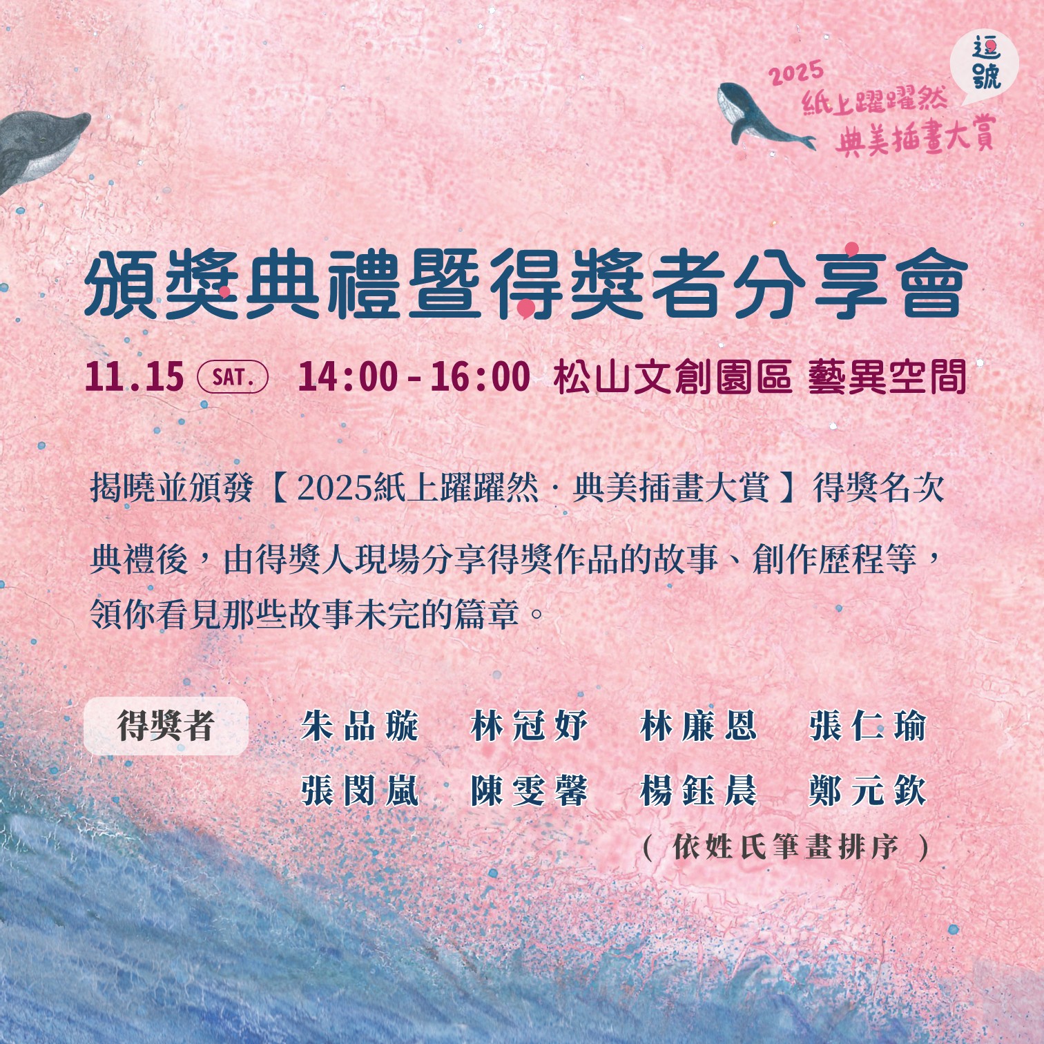 揭曉頒發【2025紙上躍躍然.典美插畫大賞】得獎名次,並邀請得獎人現場分享得獎作品故事、創作歷程等,領你看見那些故事未完的篇章。
