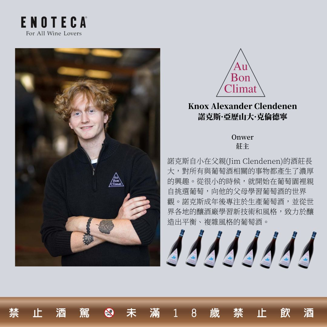 日耀酒莊 「Au Bon Climat(簡稱:ABC)」是加州聖塔芭芭拉(Santa Barbara)的指標性酒莊,由傳奇釀酒師 Jim Clendenen 於1982年創立。他專注於在 Santa Barbara 生產風格優雅、平衡且具陳年潛力的黑皮諾與夏多內,被譽為加州葡萄酒的先驅。在他逝世後,酒莊現由其子女 Isabelle 與 Knox Clendenen 共同傳承經營。